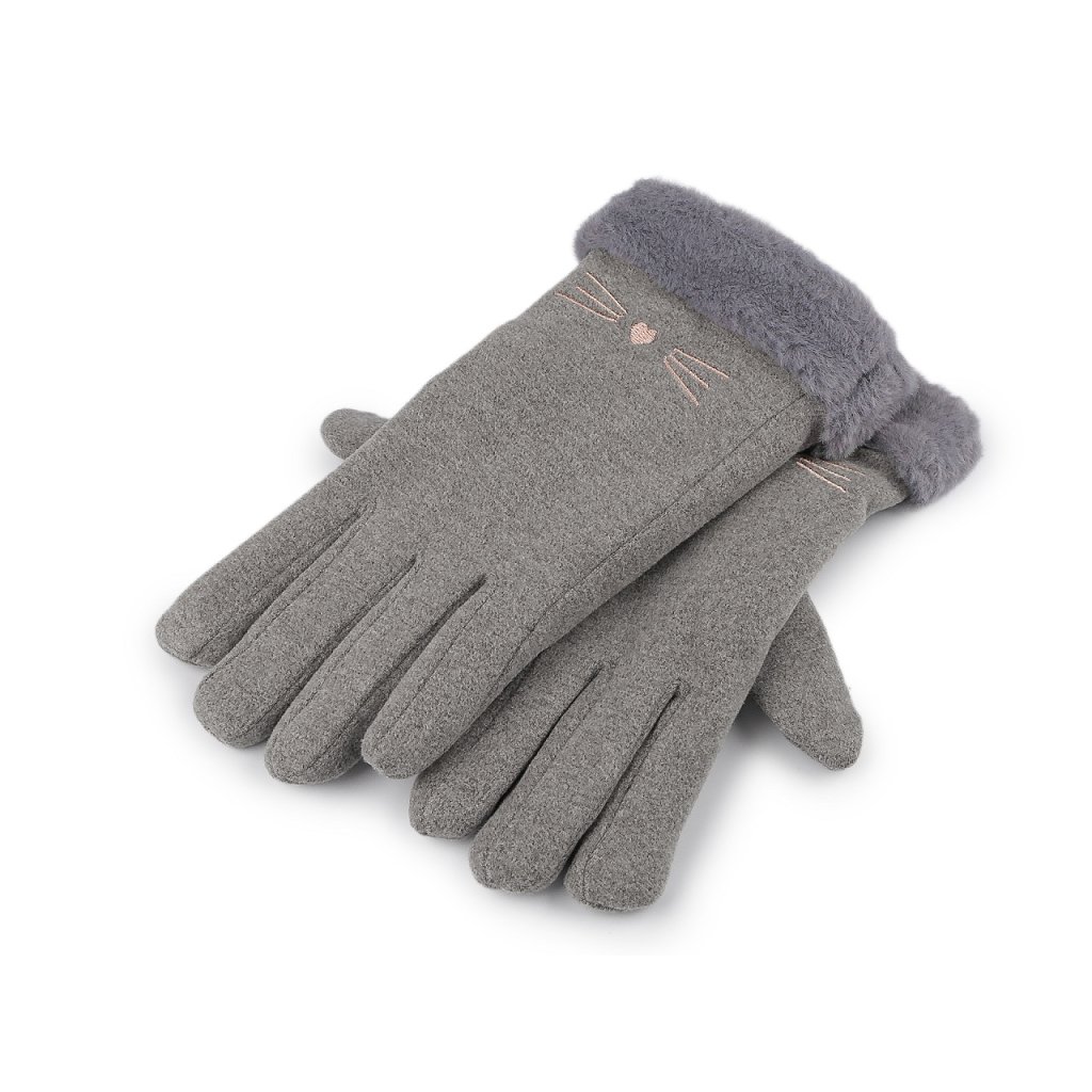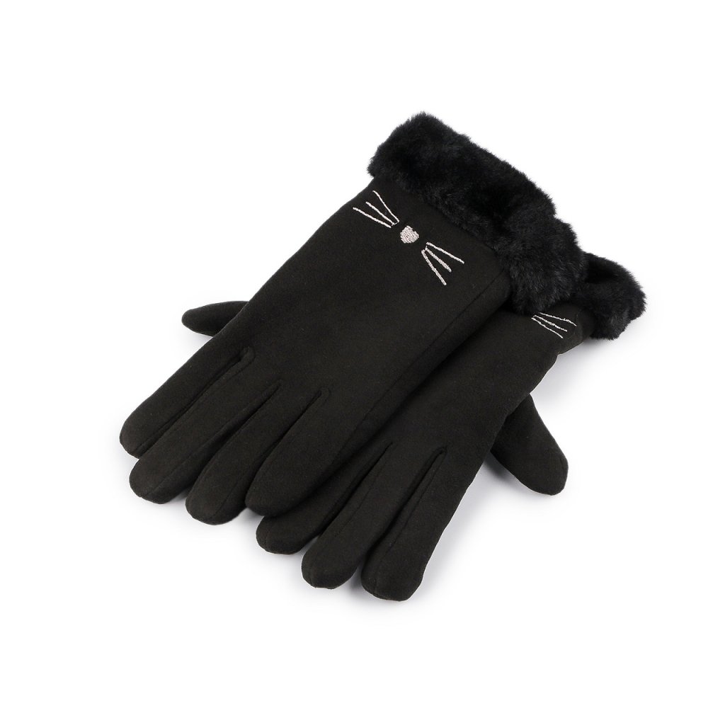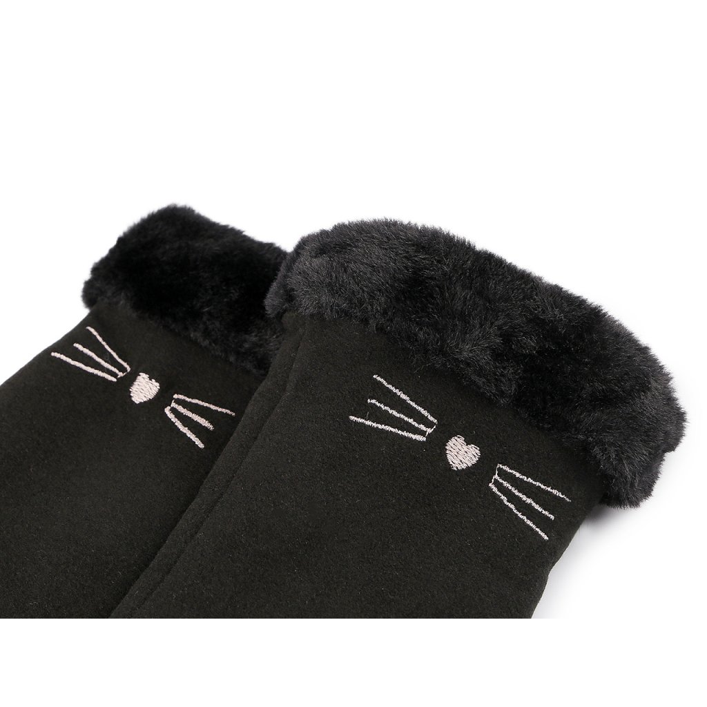 Elegantní dívčí rukavice zdobí výšivka čumáku a kožešinový lem. Rukavice jsou jemně pružné. Uvnitř mají příjemný plyšový kožíšek. Hodí se do zimy i do chladnějšího podzimního počasí. Na ukazováčku pravé ruky je vyšitý květ, díky kterému se dají ovládat dotykové přístroje - mobil, tablet, bankomat apod.