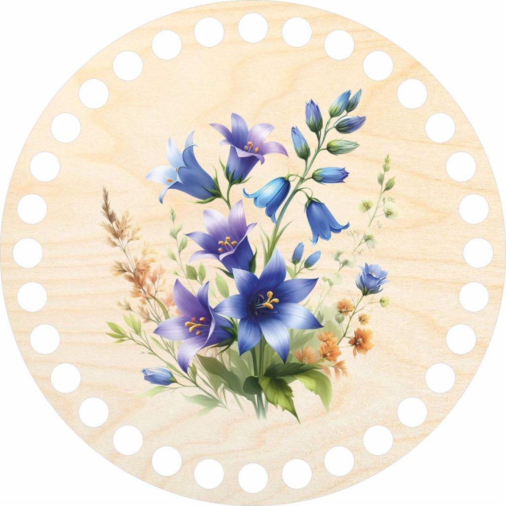 Toto kruhové dno z březové překližky s motivem květů zvonku o průměru 15 cm je nejen pevným základem pro háčkované košíky, ale také jej lze využít jako stylové víko.