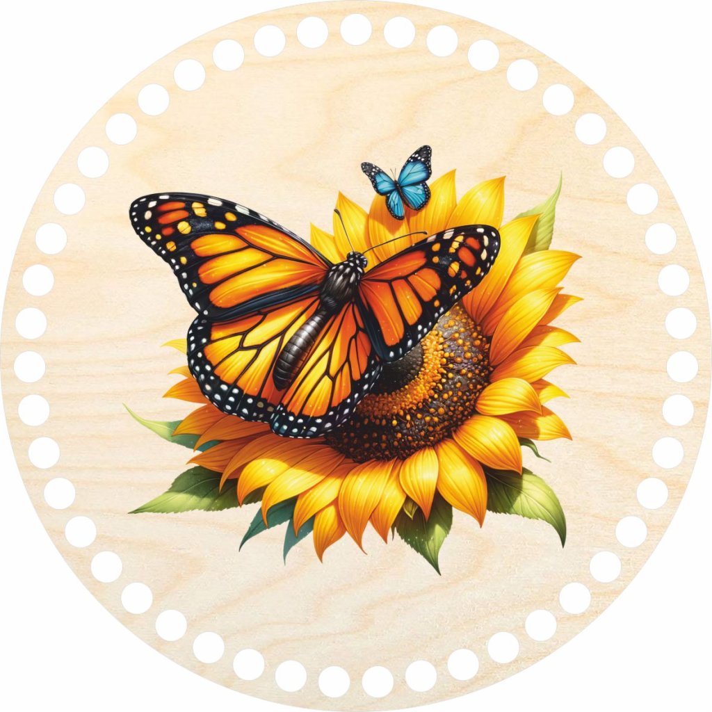 Tento kruhový výřez z březové překližky je ideální volbou pro milovníky háčkování, kteří touží po vytvoření košíků s autentickým přírodním vzhledem. S průměrem 20 cm a 3 mm silným materiálem poskytuje pevnou základnu pro vaše ručně vyráběné košíky. Jeho povrch je ozvláštněný krásným motivem motýla sedícího na květu slunečnice, který je aplikován pomocí UV tisku pro dlouhotrvající barvy a odolnost proti vyblednutí. Tento způsob tisku zaručuje, že motiv zůstane živý a čistý i při častém používání.
