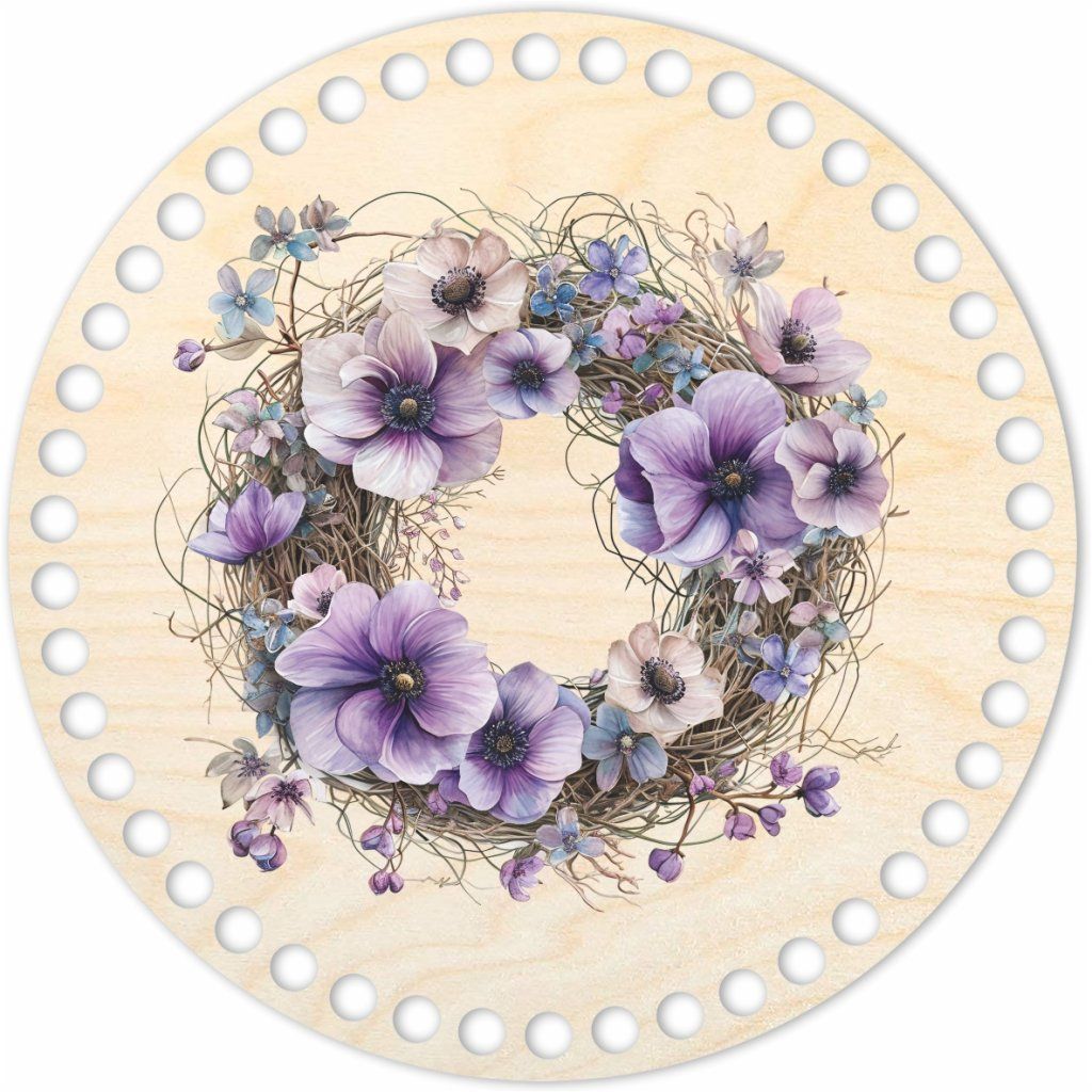Dno nebo víko z březové překližky s barevným potiskem pro výrobu háčkovaných košíků, podtácků, podnosů a dalších. Níže vyberte, zda požadujete dno/víko na háčkování s otvory po obvodu, případně zda požadujete plné víko na košík s otvorem na knopku nebo ouško.
