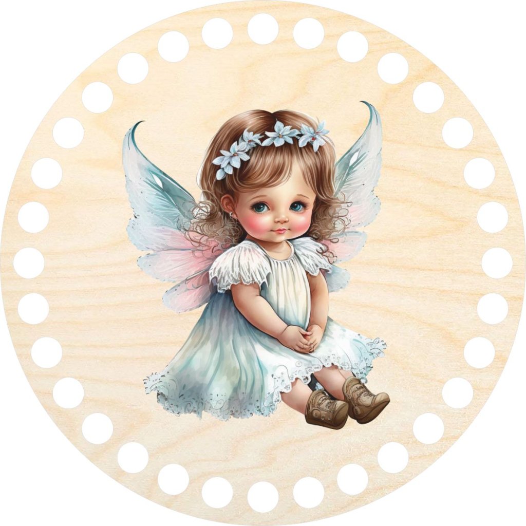 Víko s motivem "Andílek" pro košíky vyráběné ze špagetových přízí. Motiv je vytištěn UV tiskárnou na víko z březové překližky.