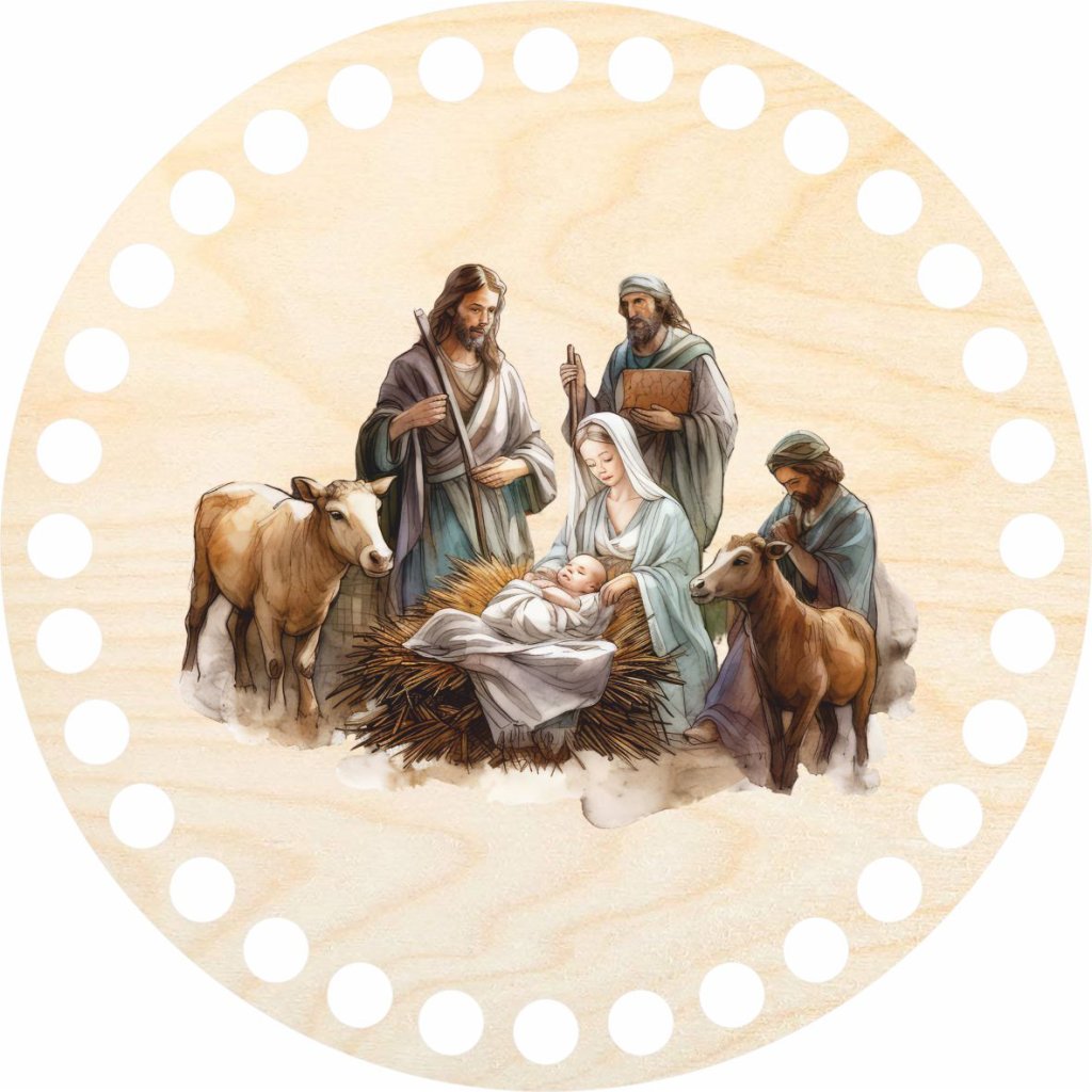 Víko pro košíky vyráběné ze špagetových přízí. Motiv je vytištěn UV tiskárnou na víko z březové překližky.