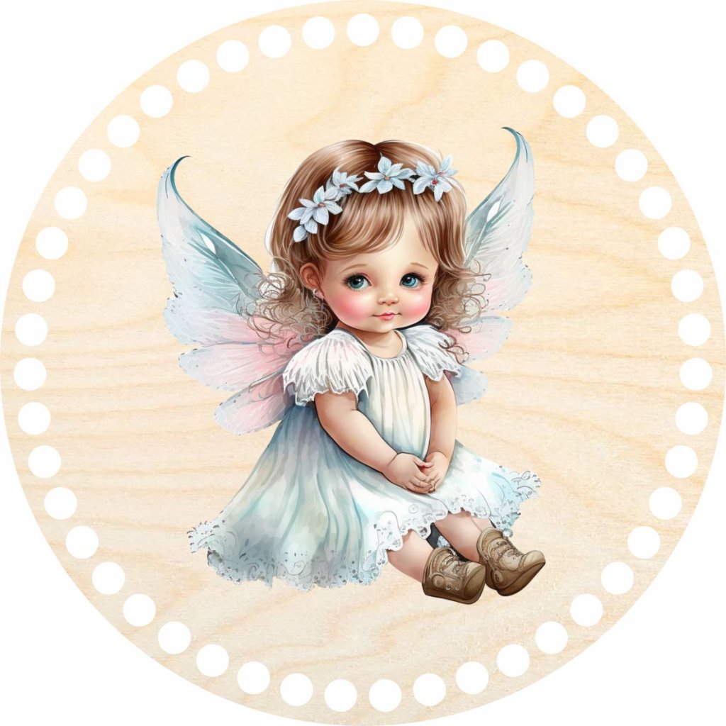 Víko s motivem "Andílek" pro košíky vyráběné ze špagetových přízí. Motiv je vytištěn UV tiskárnou na víko z březové překližky.