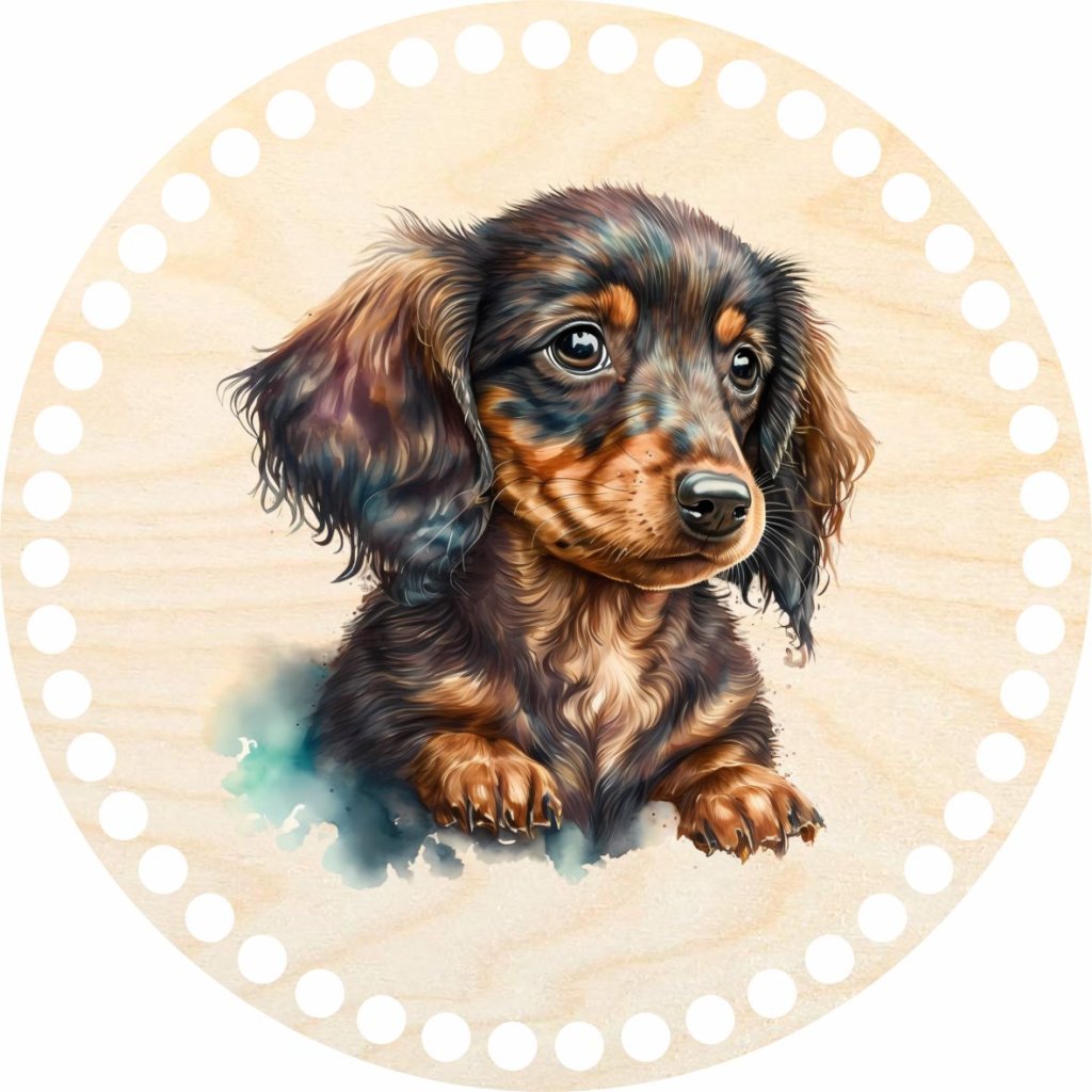 Víko s motivem "Jezevčík" pro košíky vyráběné ze špagetových přízí. Motiv je vytištěn UV tiskárnou na víko z březové překližky.