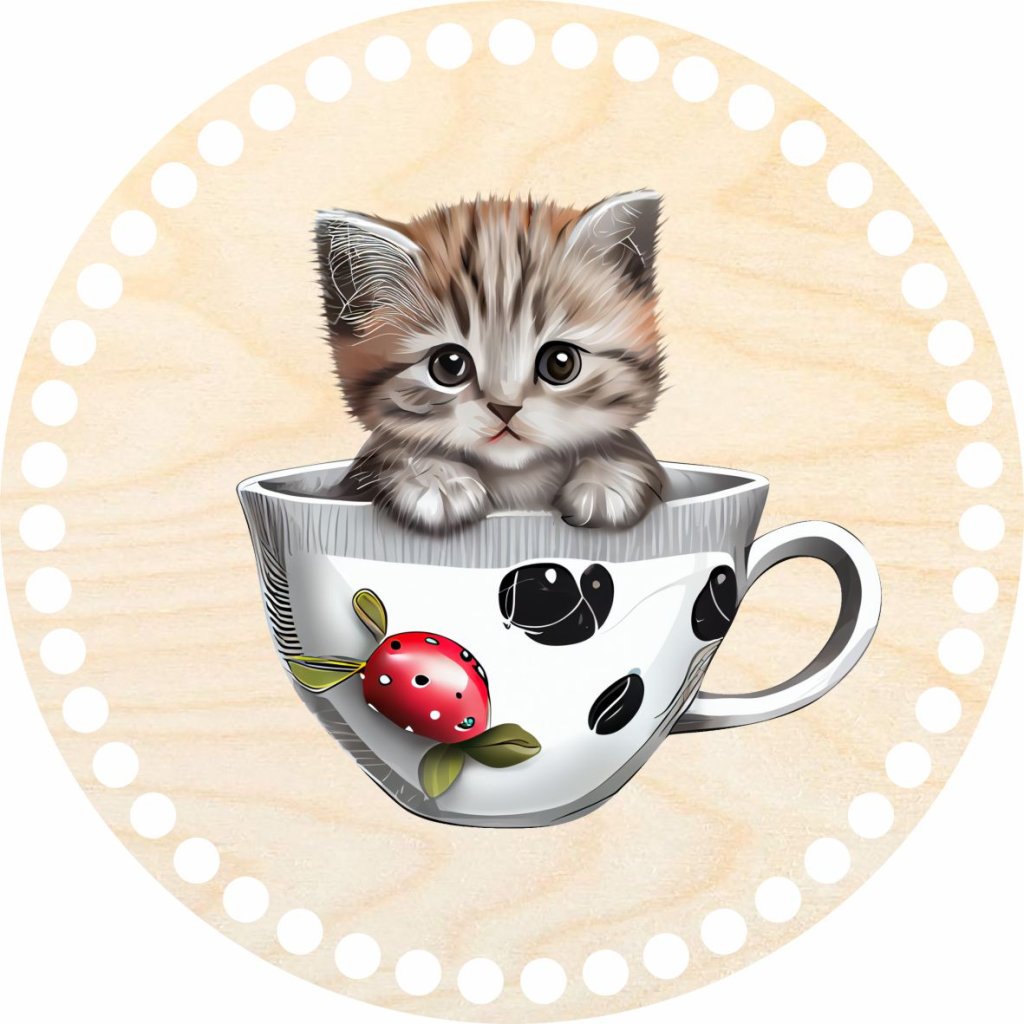 Víko s motivem "Kotě v hrnku" pro košíky vyráběné ze špagetových přízí. Motiv je vytištěn UV tiskárnou na víko z březové překližky.