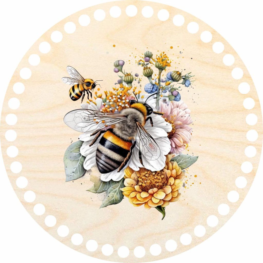 Víko s motivem "Včely" pro košíky vyráběné ze špagetových přízí. Motiv je vytištěn UV tiskárnou na víko z březové překližky.