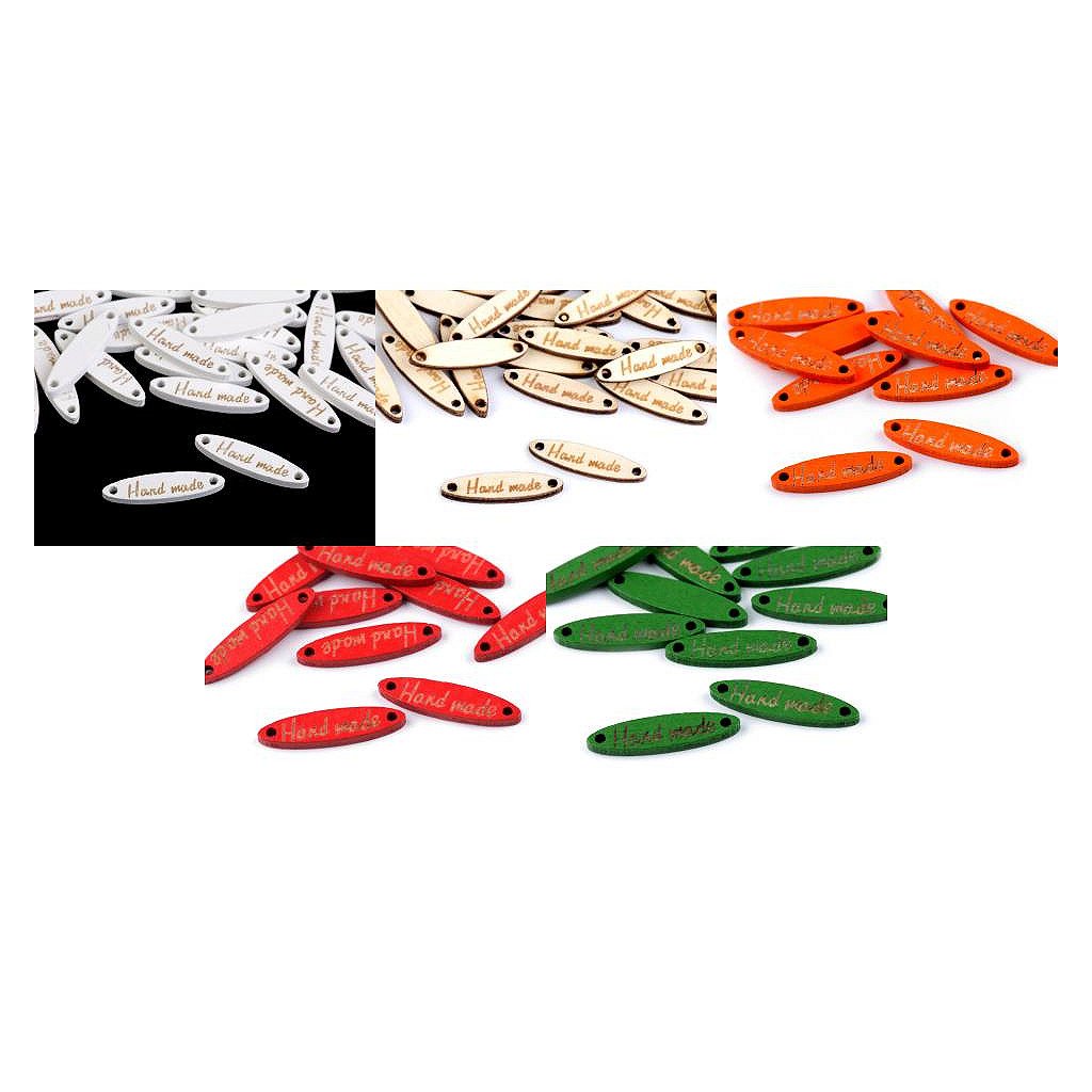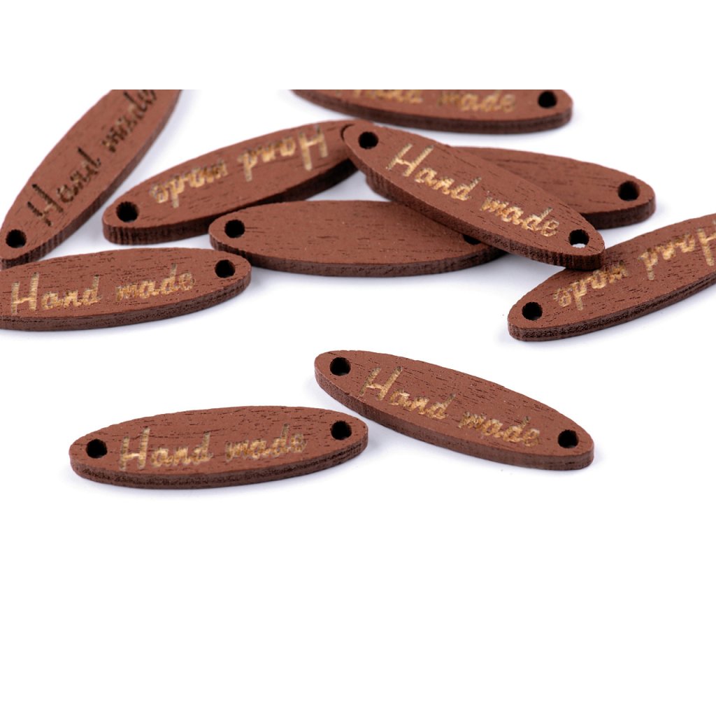 Dřevěnou cedulku oválného tvaru zdobí jednostranný nápis "hand made". Po stranách jsou dírky, kterými lze provléct šňůrku a cedulku tak pověsit na dekoraci.