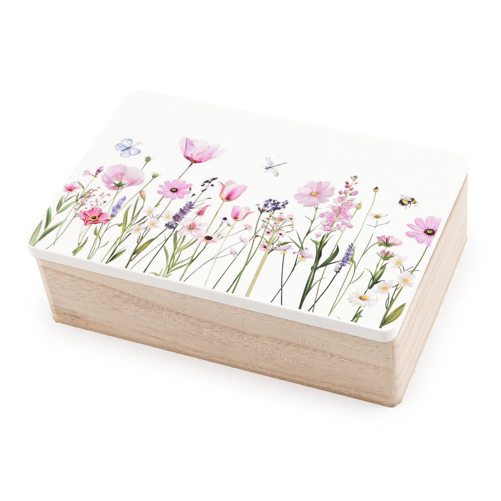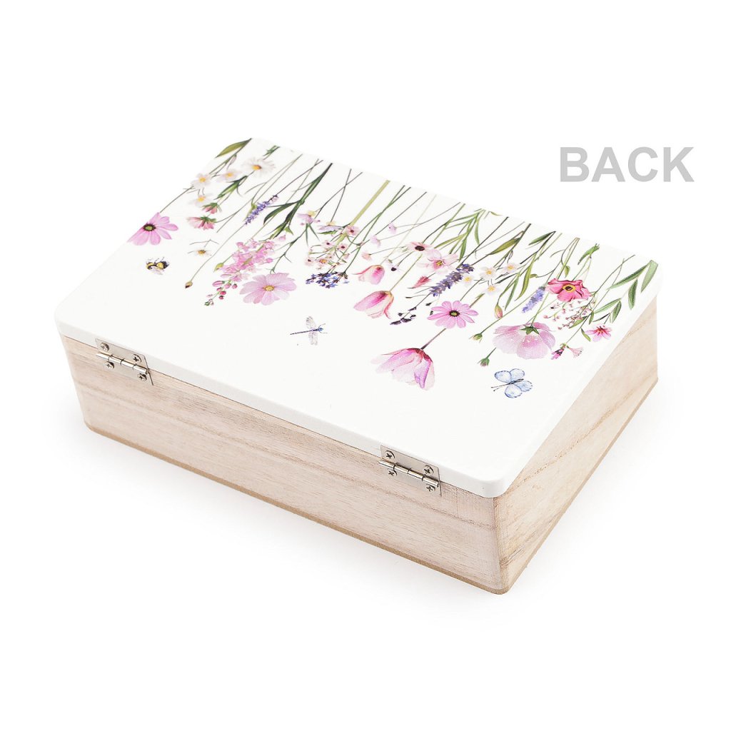 Dřevěná krabička s květinovým potiskem představuje spojení elegance a praktičnosti. Schová všechny vaše poklady a navíc interiéru dodá romantický nádech. Je ideální pro uchování drobností jako jsou šperky, gumičky a sponky do vlasů, klíče nebo malé suvenýry.