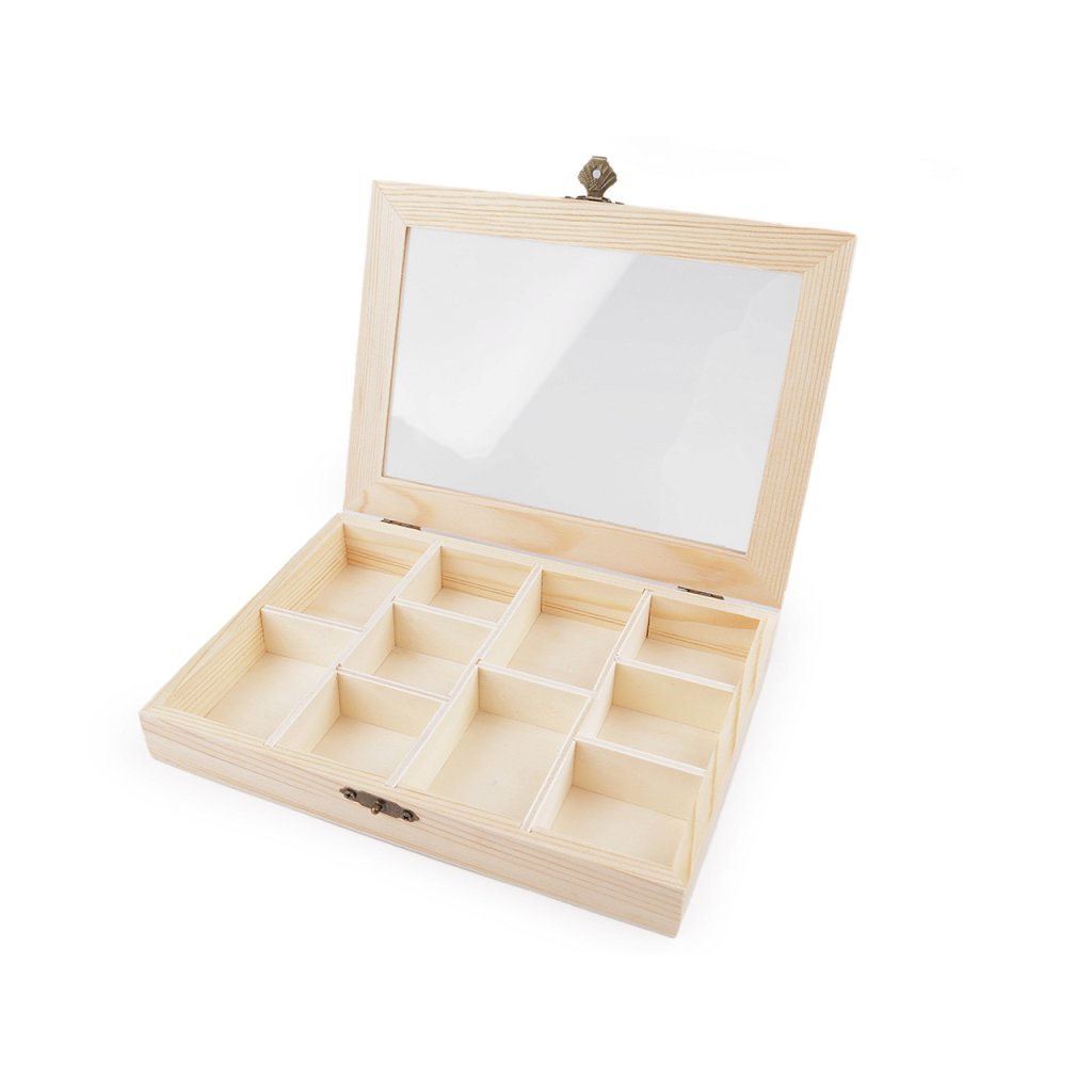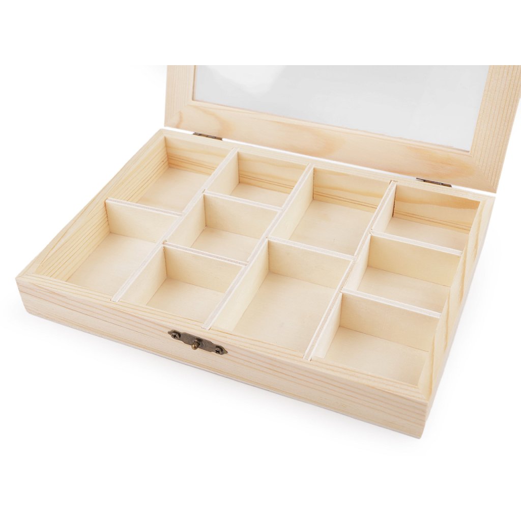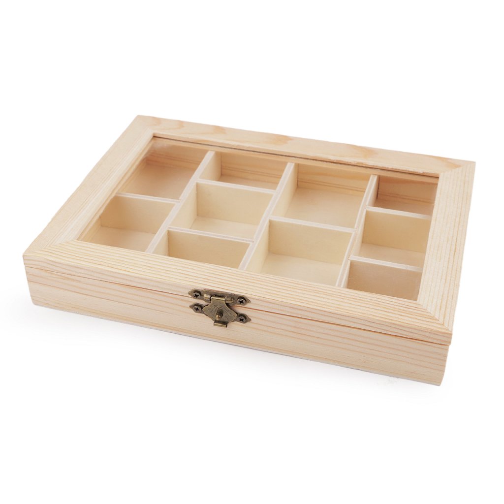 Dřevěná krabička s průhledným skleněným víkem se hodí na uložení drobného materiálu na vaše kreativní tvoření. Víko je odklápěcí, s kovovým zapínáním a panty. Hodí se na korálky, knoflíky, bižuterní materiál apod. Najde využití i jako stylový organizér v domácnosti, do skříně, šuplíku apod. Vejdou se do ní náramky, gumičky, sponky apod. Je oblíbená i sběrateli drahých kamenů a minerálů.