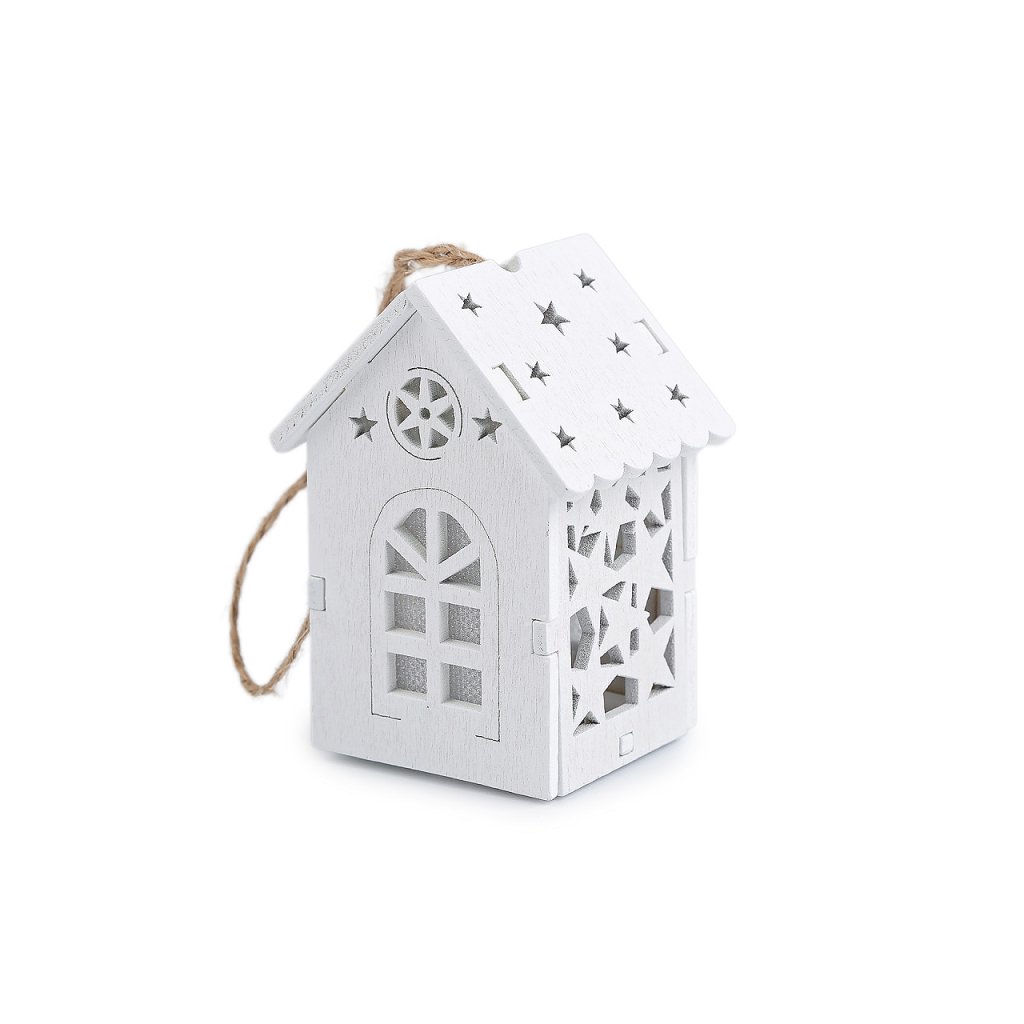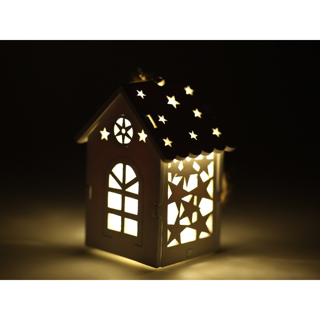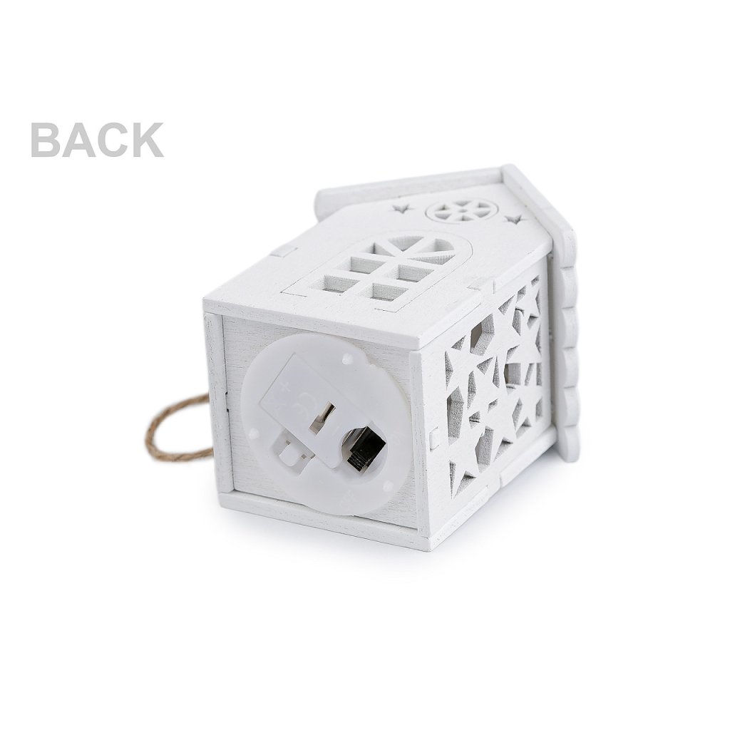 Svítící dřevěný domeček s precizně zpracovanými výřezy můžete díky poutku pověsit na stromeček nebo dekorační věnce. Vynikne také jako ozdoba svátečního stolu. Svítí příjemným teplým světlem.