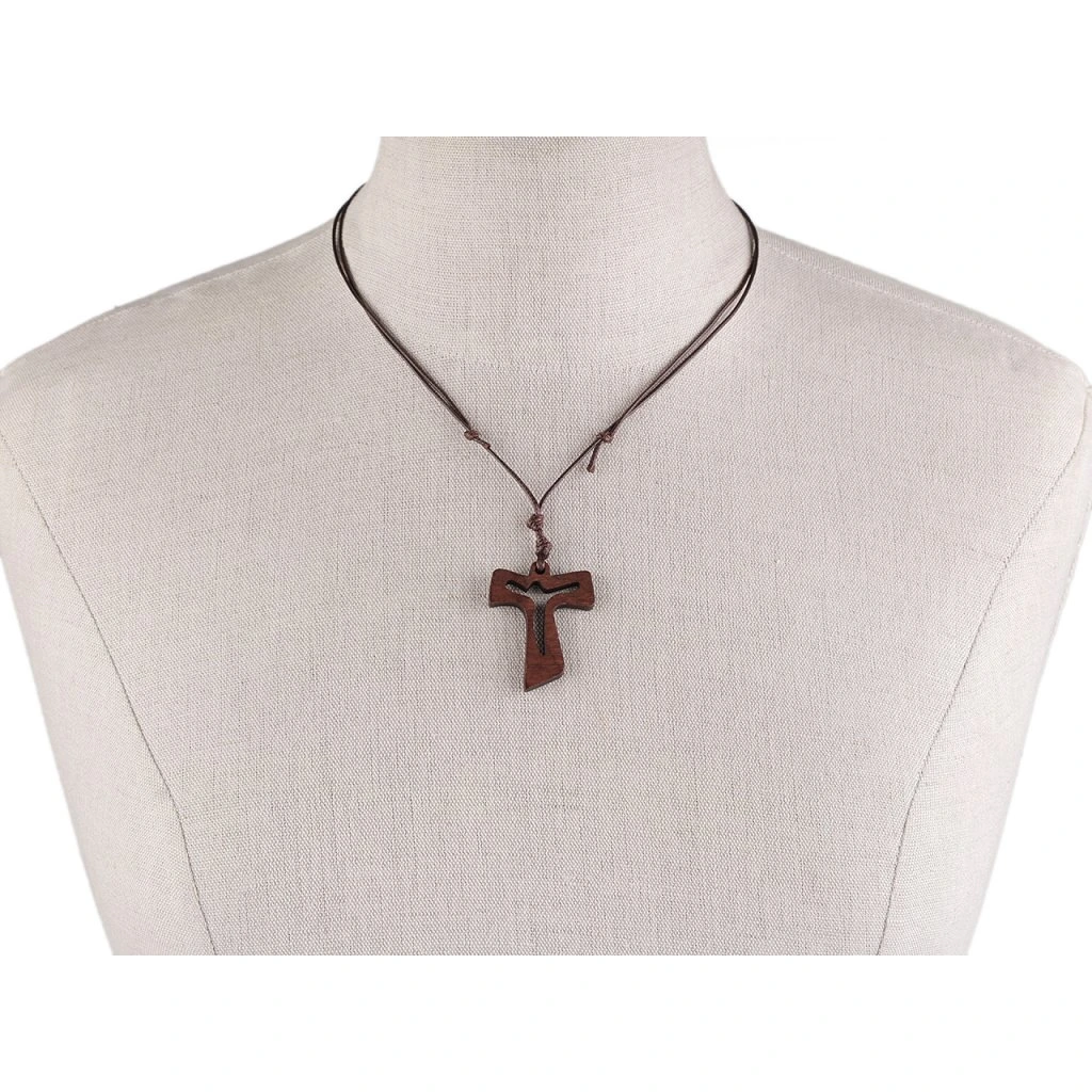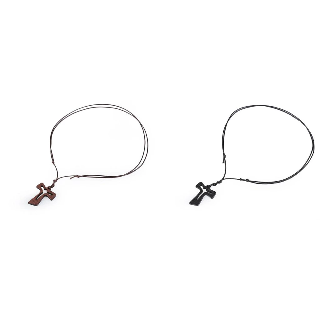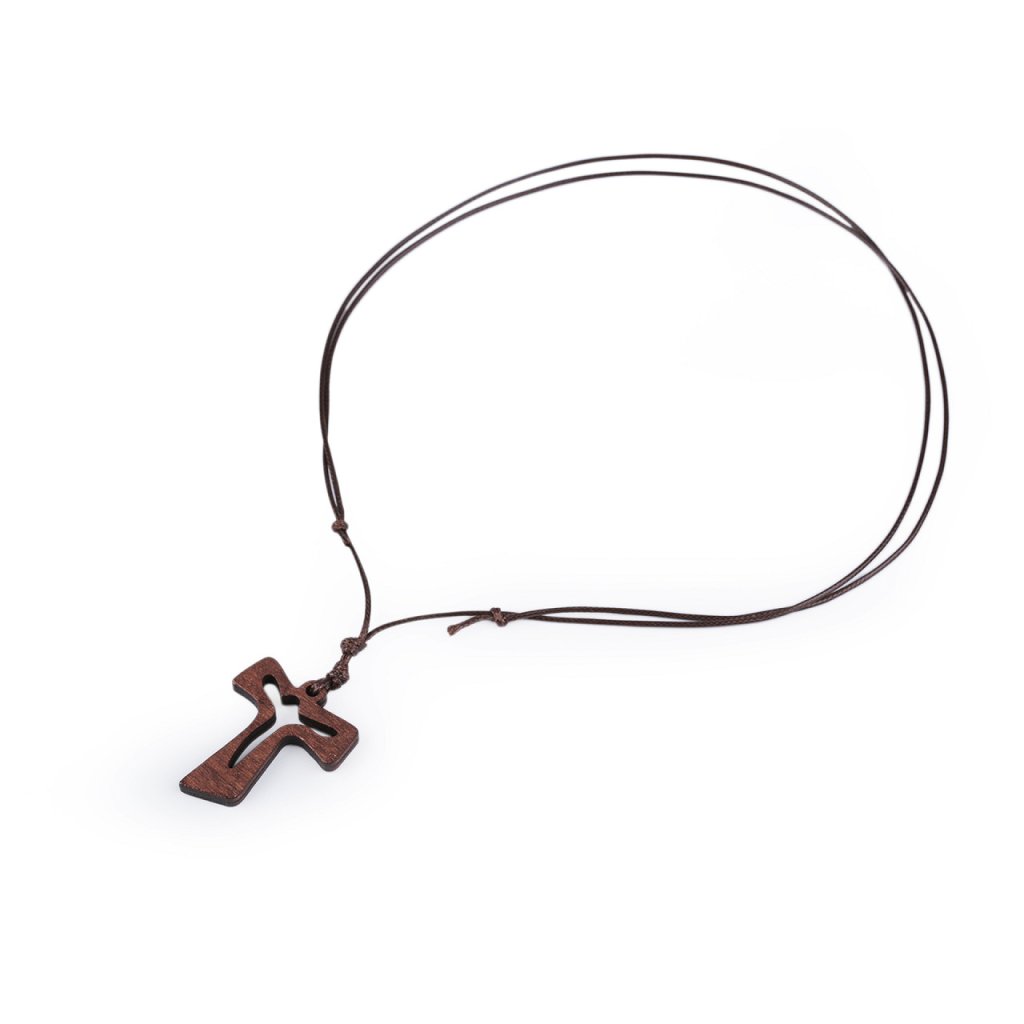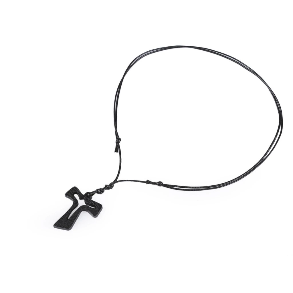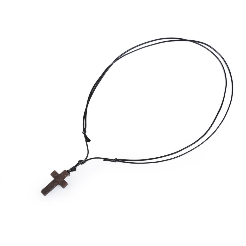 Náhrdelník zaujme pozornost svým dřevěným přívěskem kříže. Nemá zapínání, jeho délku si můžete upravit pomocí posuvných uzlů.