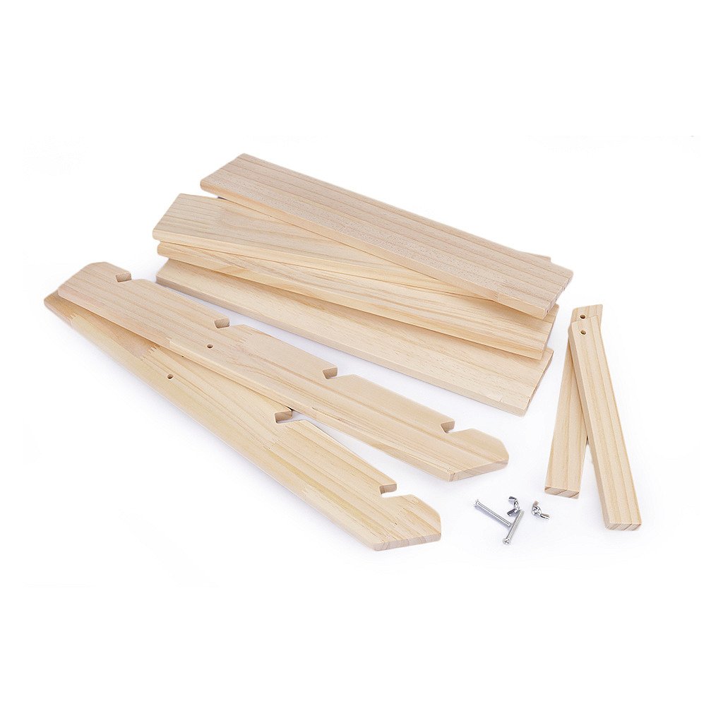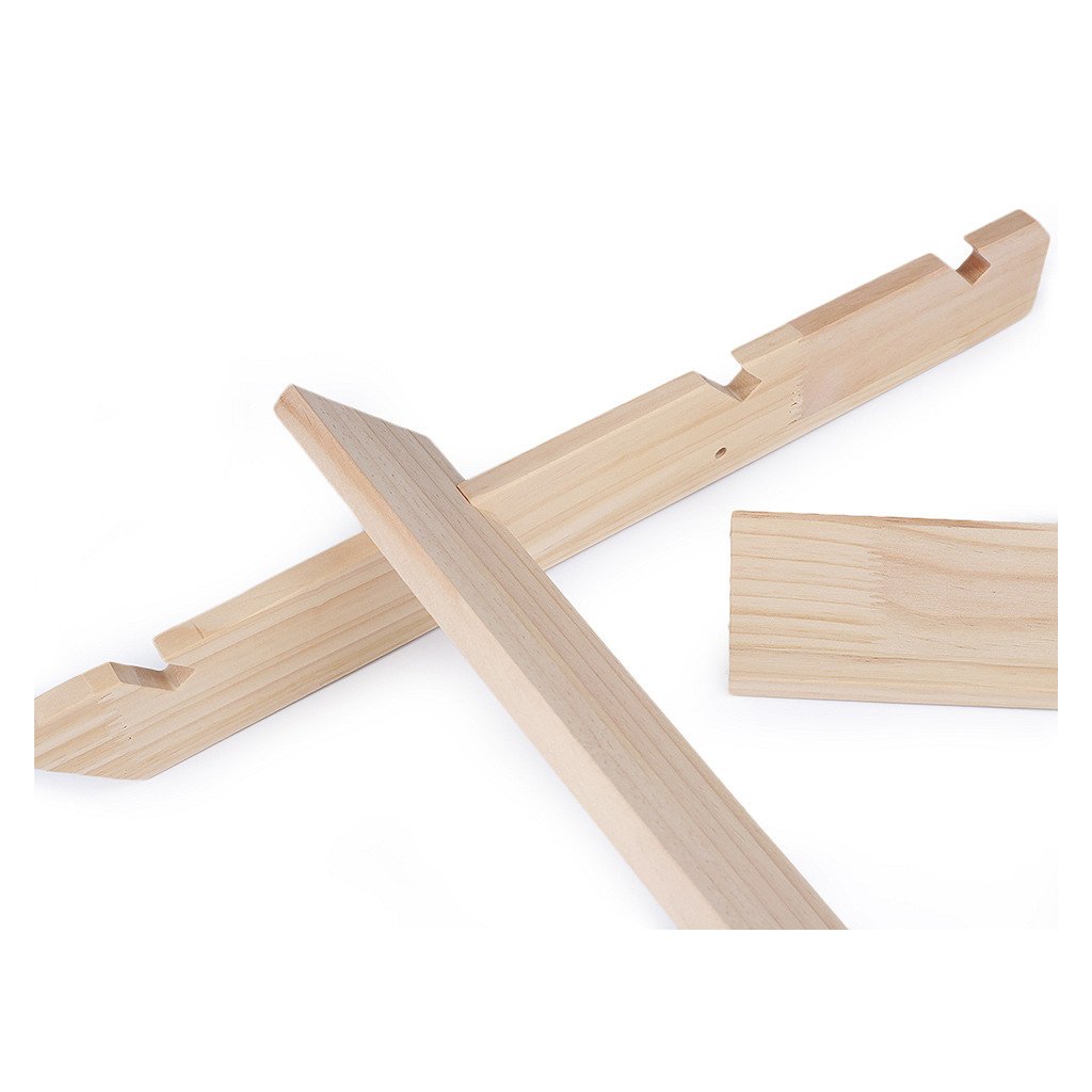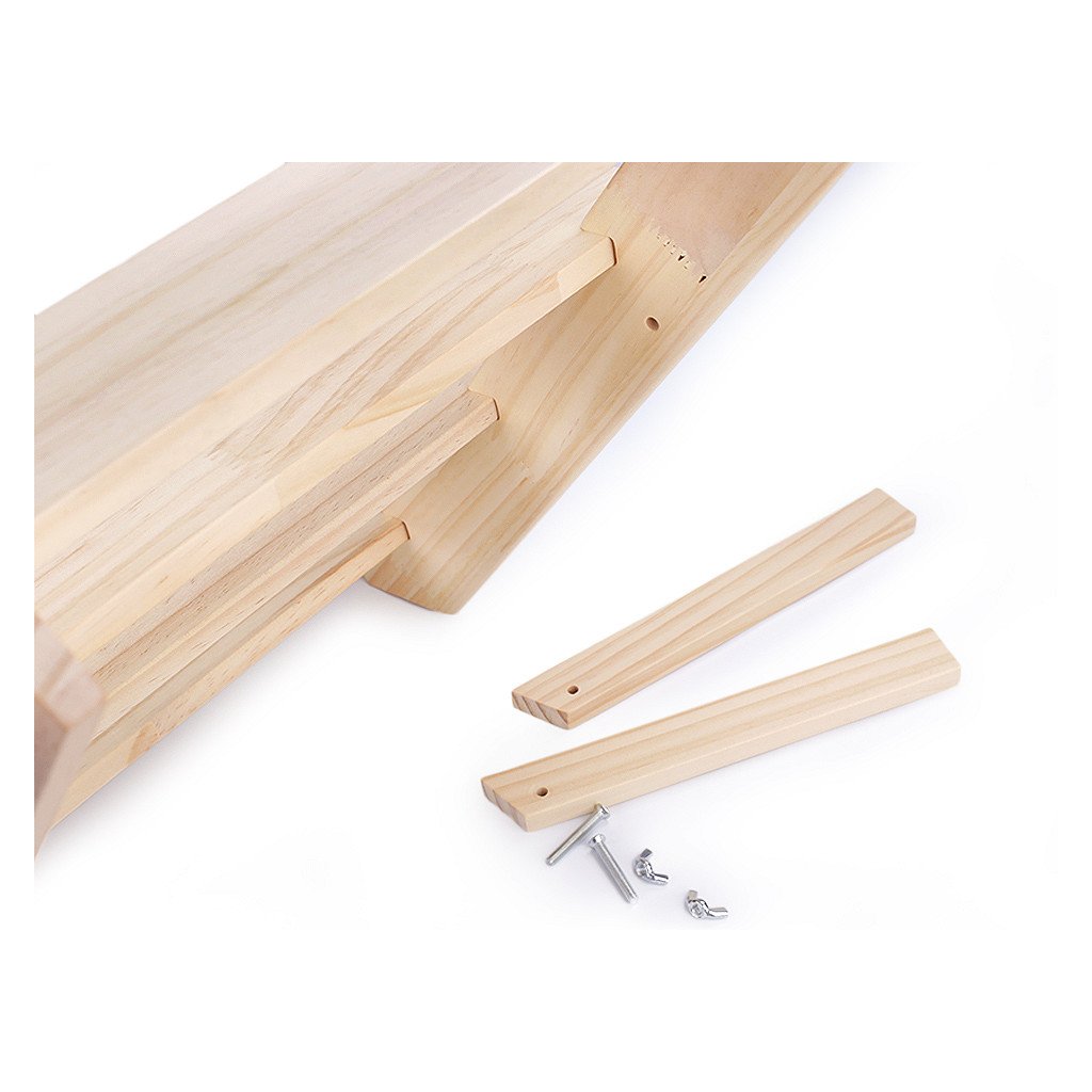 Rozměry samotného patra jsou 8 x 39,5 cm. Patra se na složeném stojanu nepřekrývají, může se na nich umístit cokoliv vysokého. Z jedné strany jsou v prkně vygravírované 3 drážky na vložení cedulky s popiskou. Můžete se sami rozhodnout, zda budete mít na horní straně hladké dřevo či využijete stranu s drážkami.