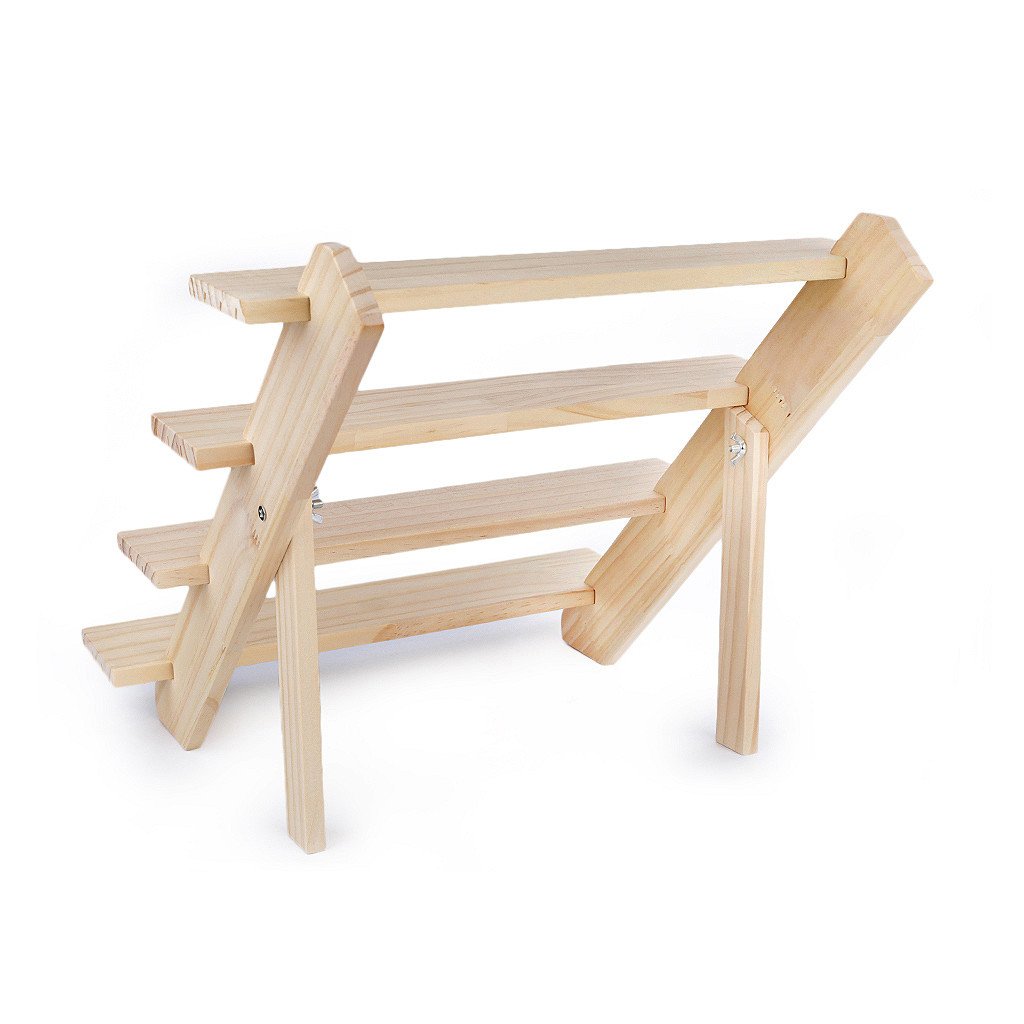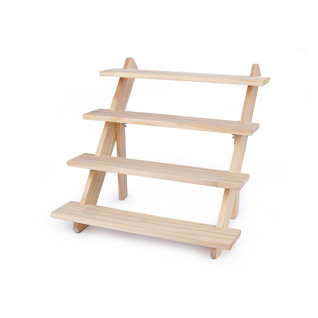 Čtyřpatrový dřevěný stojan je vhodný k prezentaci výrobků ve výlohách. Stupňovité uspořádání šetří místo v prostoru.