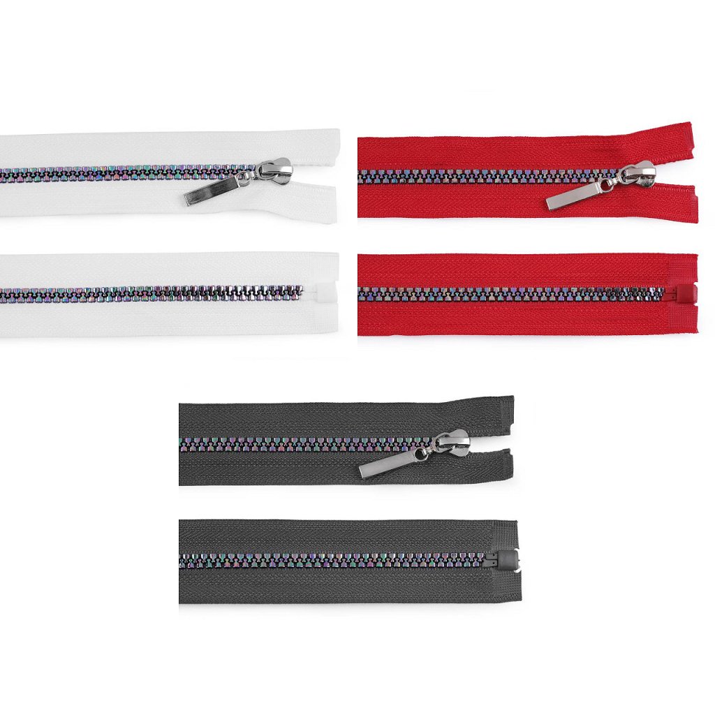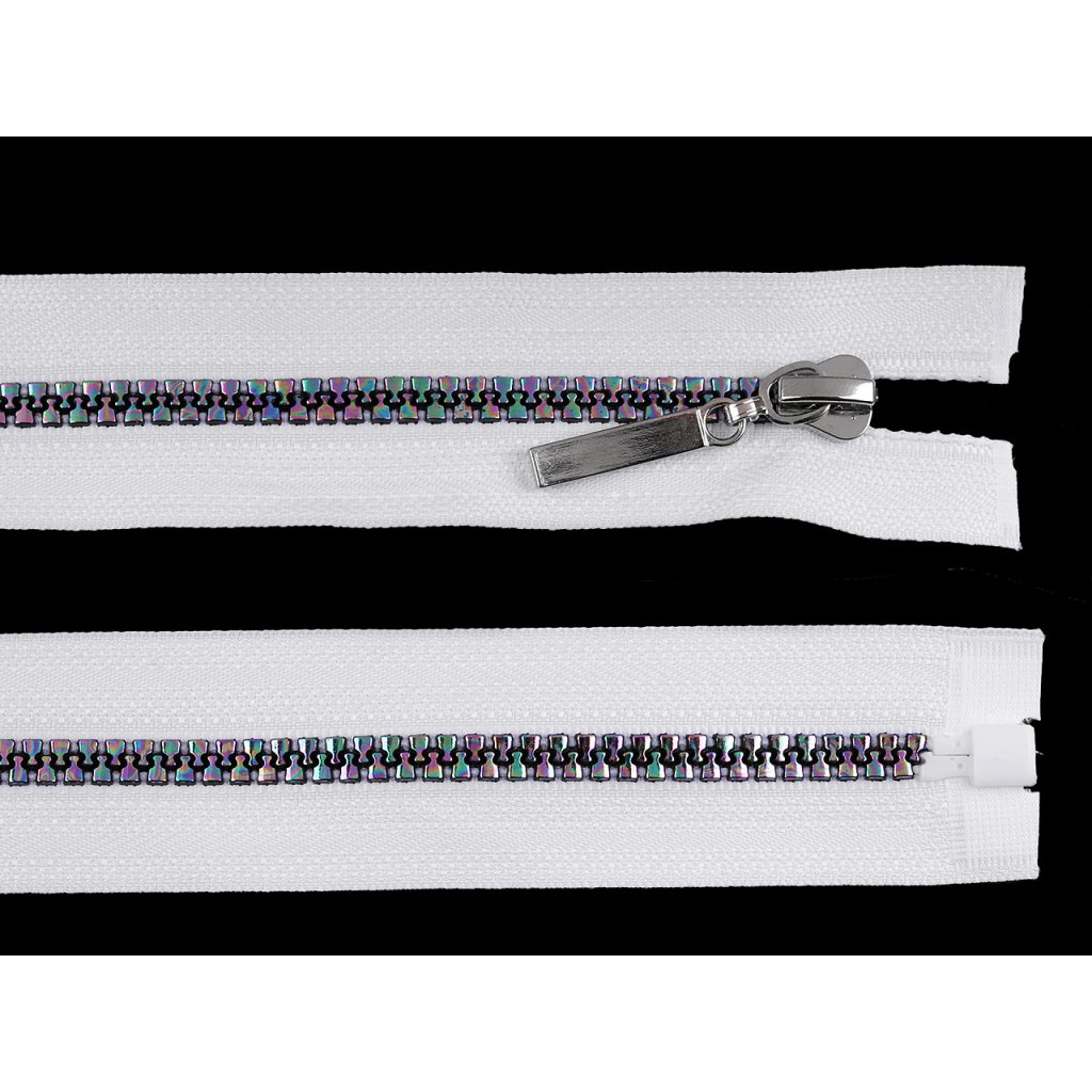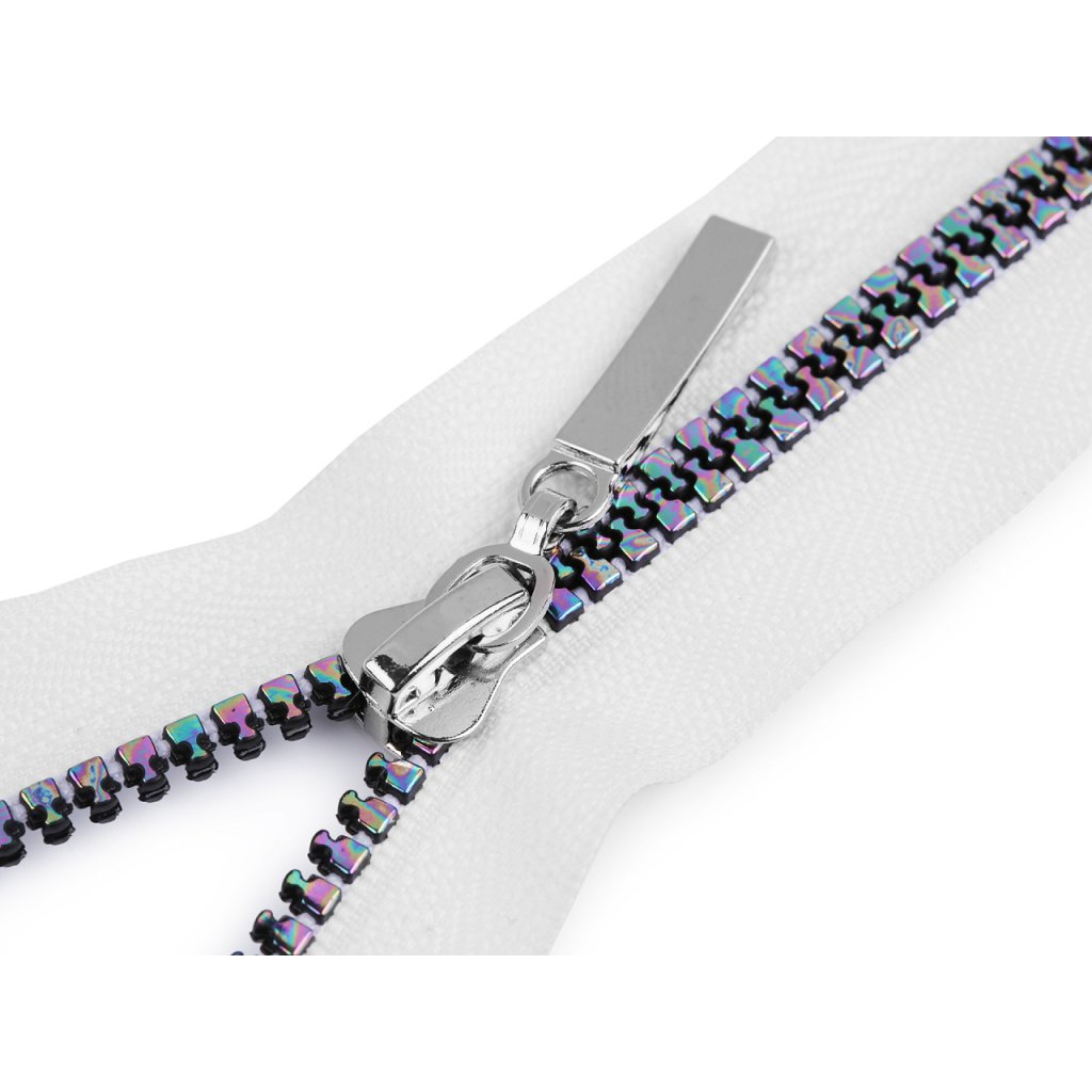 Kostěný zip upoutá pozornost duhovým efektem, který dodá vašemu oblečení atraktivní vzhled. Zip můžete použít na bundy, kabáty, mikiny, svetry, apod.