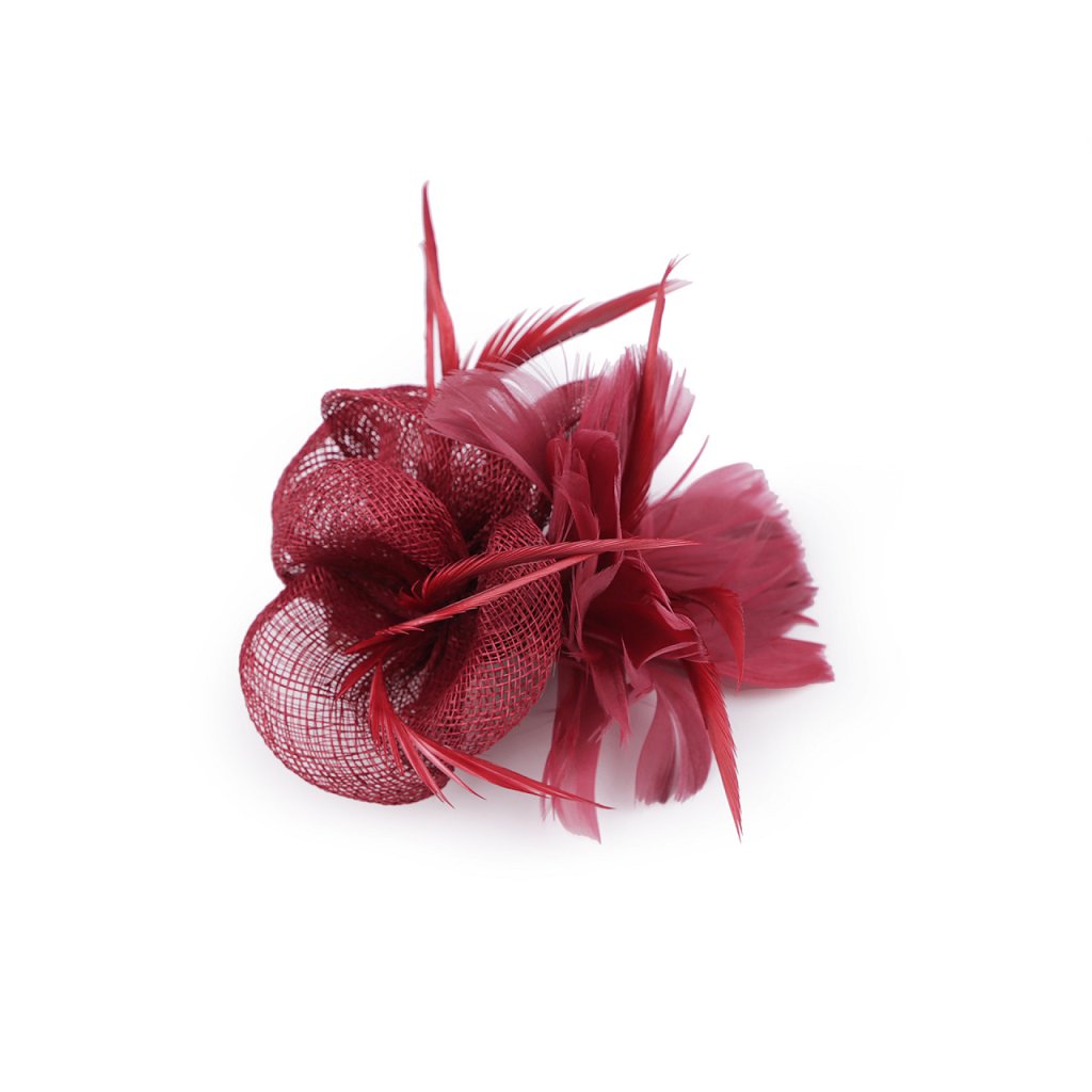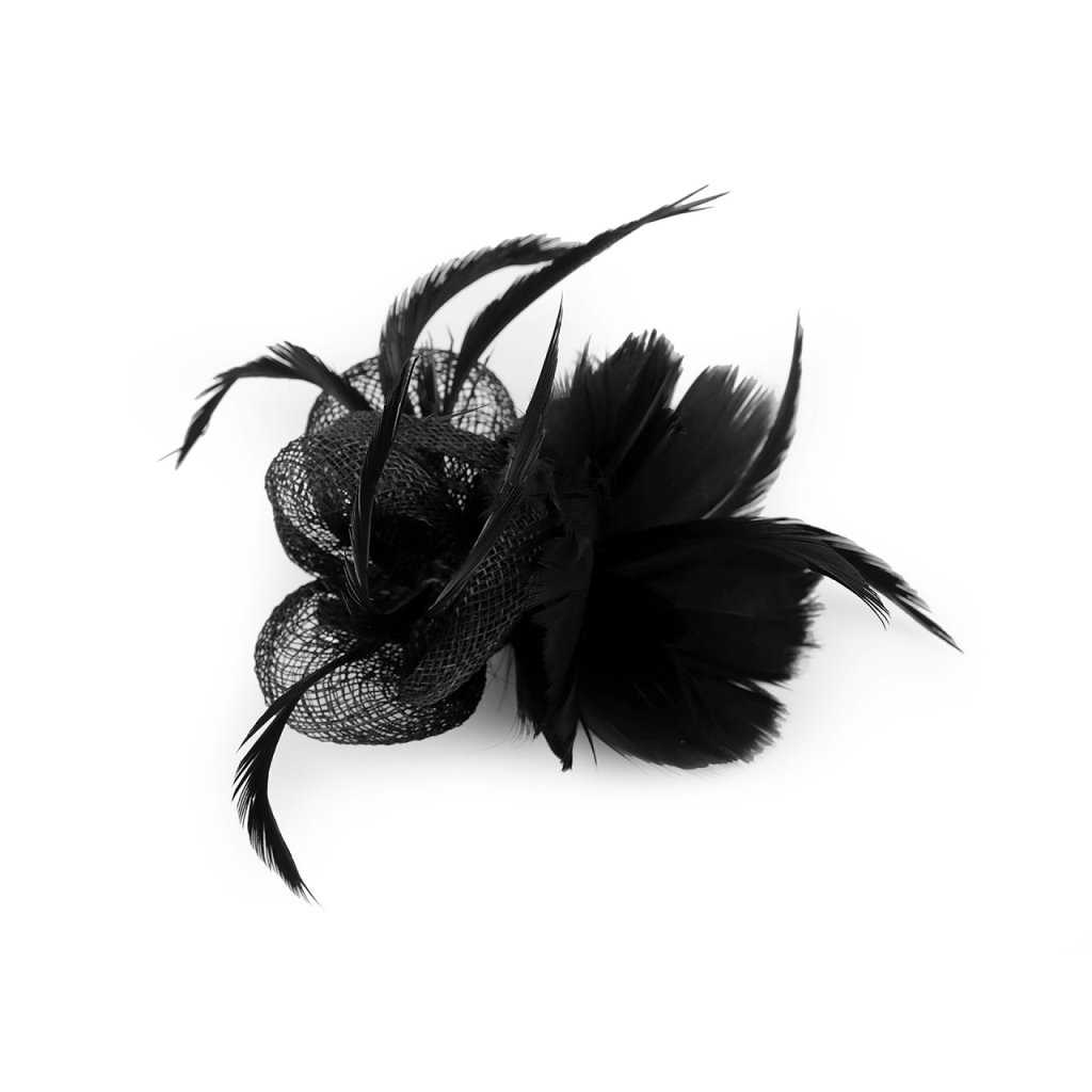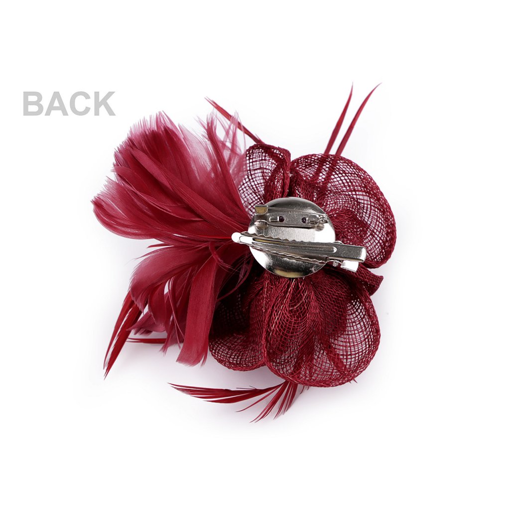 Noblesní fascinátor s peříčkovým květem ibišku využijete na společenské akce jako jsou plesy, svatby či návštěvy divadla. Dá se připnout i jako zajímavá brož. Květy jsou tři, jeden je z peří, další jsou vyrobené z modistické síťky, střed mají zkrášlený pírky.