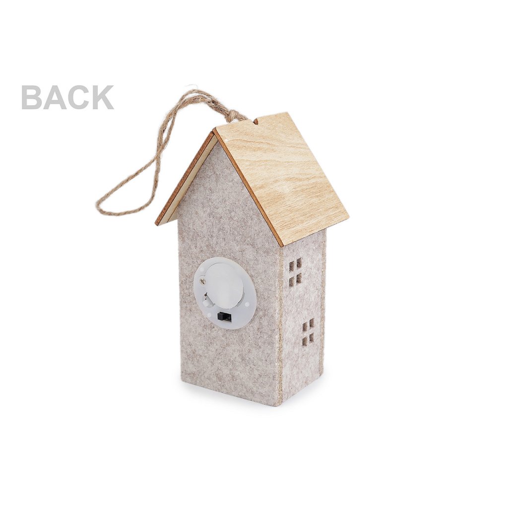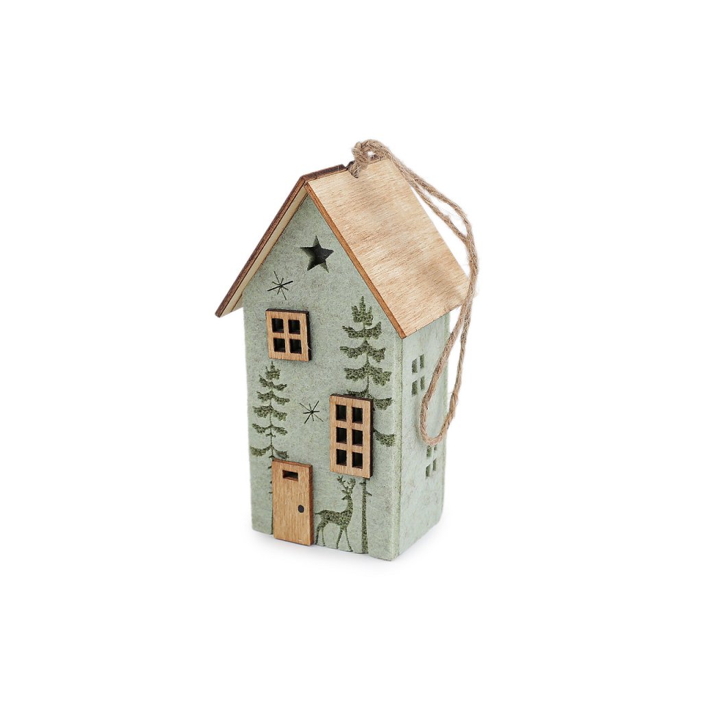 Svítící dekorační domeček má základ z pevného filcu a střechu a detaily ze dřeva. Přední stranu zdobí motiv lesa s jelenem a výřezy hvězd. Svítí příjemným teplým světlem, které zútulní každý interiér. Díky poutku ho můžete pověsit na větvičky ve váze, na věnce i na vánoční stromeček.