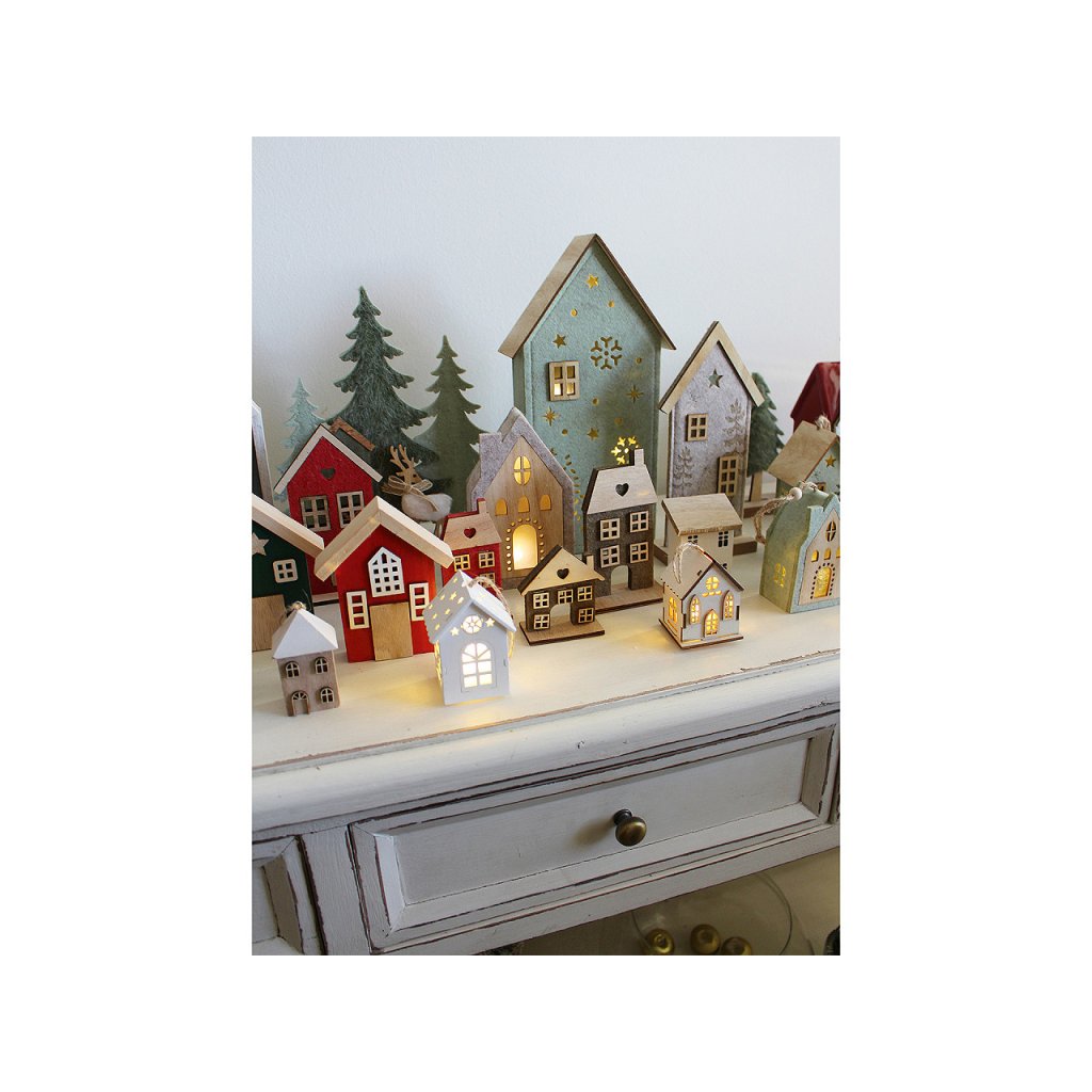 Dekorační domeček má základ z pevného filcu a střechu, podstavec a detaily ze dřeva. Přední stranu zdobí motiv lesa s jelenem a výřezy hvězd. Zútulní každý interiér. Domeček je ideální pro různé sezónní a sváteční období, zvláště pak jako stylová vánoční dekorace. Můžete ho umístit na krbovou římsu, okenní parapet, poličku nebo vynikne jako součást větší dekorativní kompozice na stole.