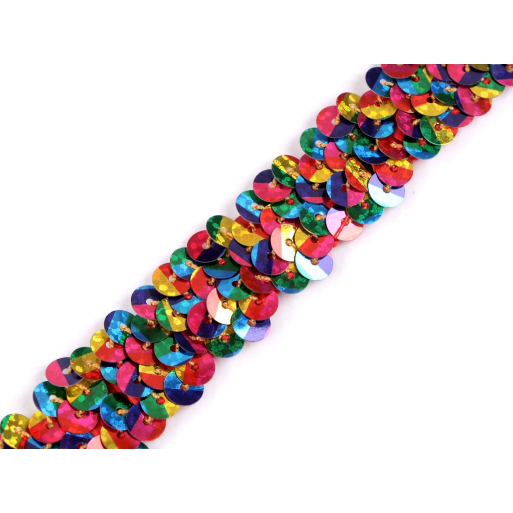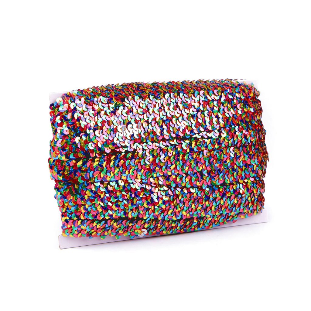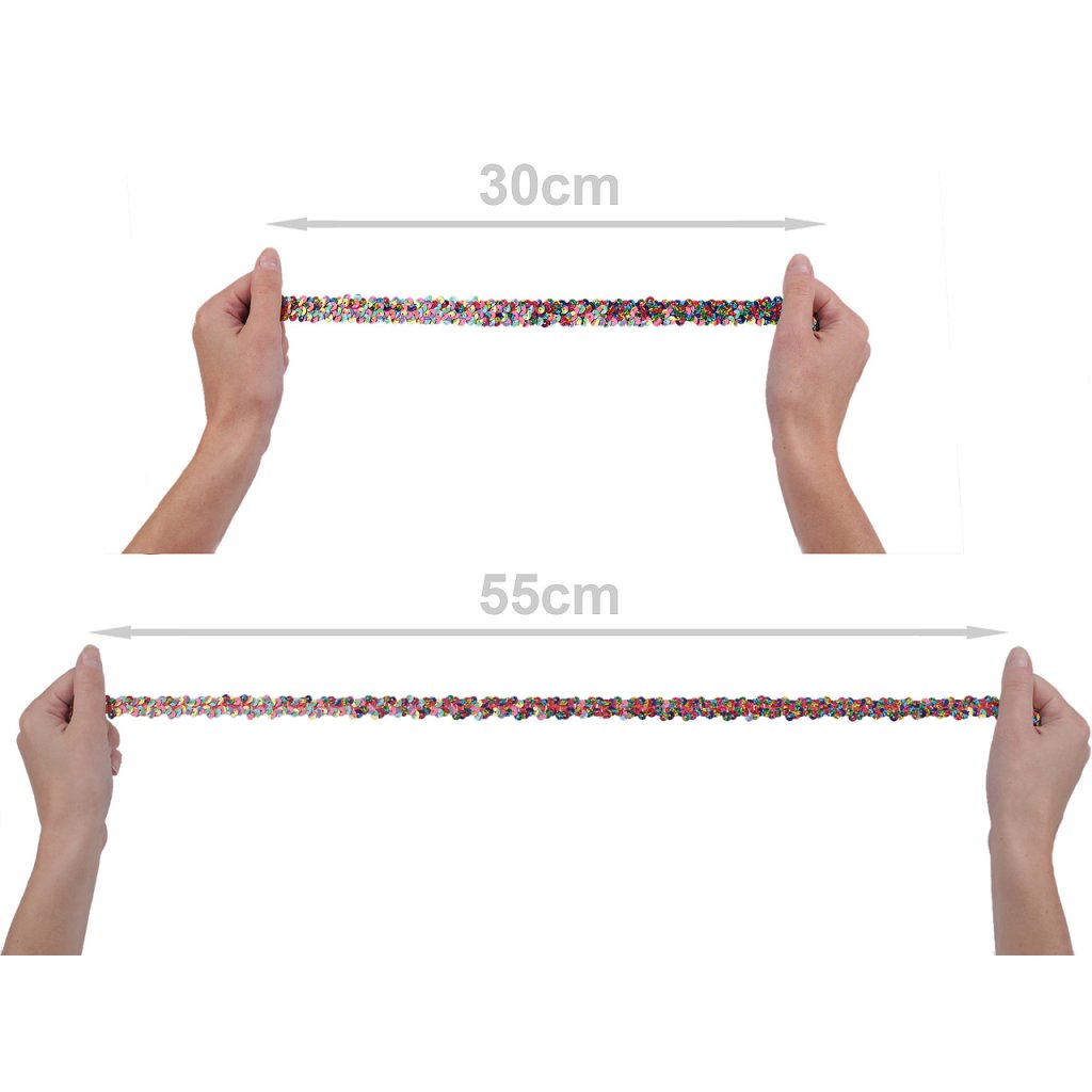 Elastický flitrový prýmek je velice efektní. Usnadní vám práci s jednotlivým našíváním flitrů. Flitry jsou připevněné na tenké pruženky cik - cak způsobem, působí bohatým dojmem. Po maximálním natažení pruženky se seřadí do dvou řad. Průměr flitrů je 6 mm.
