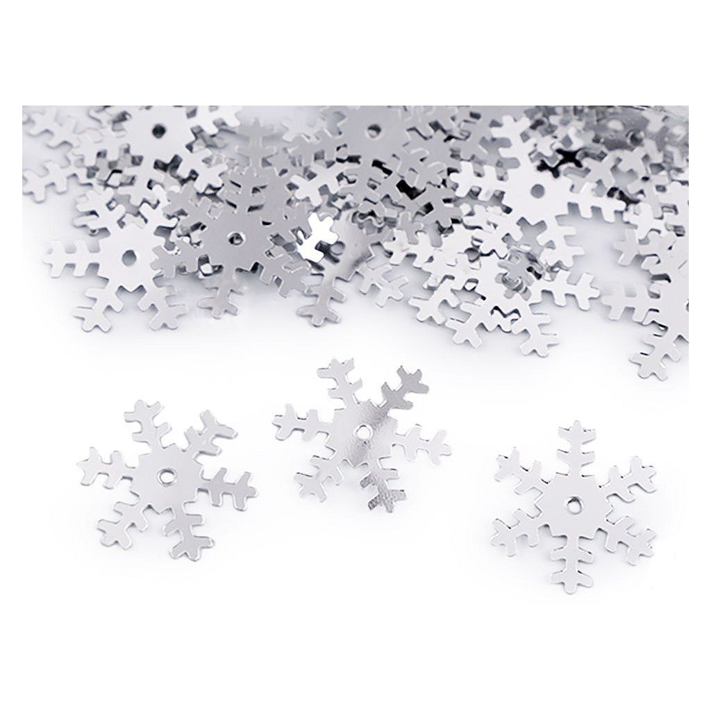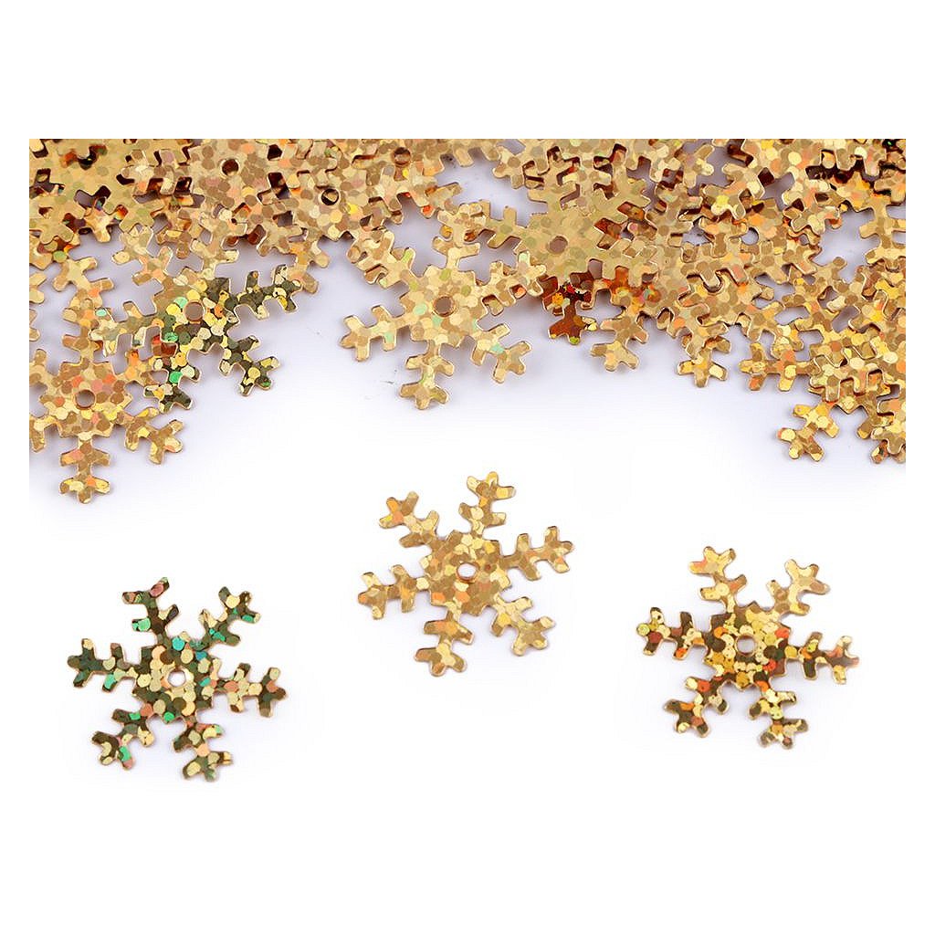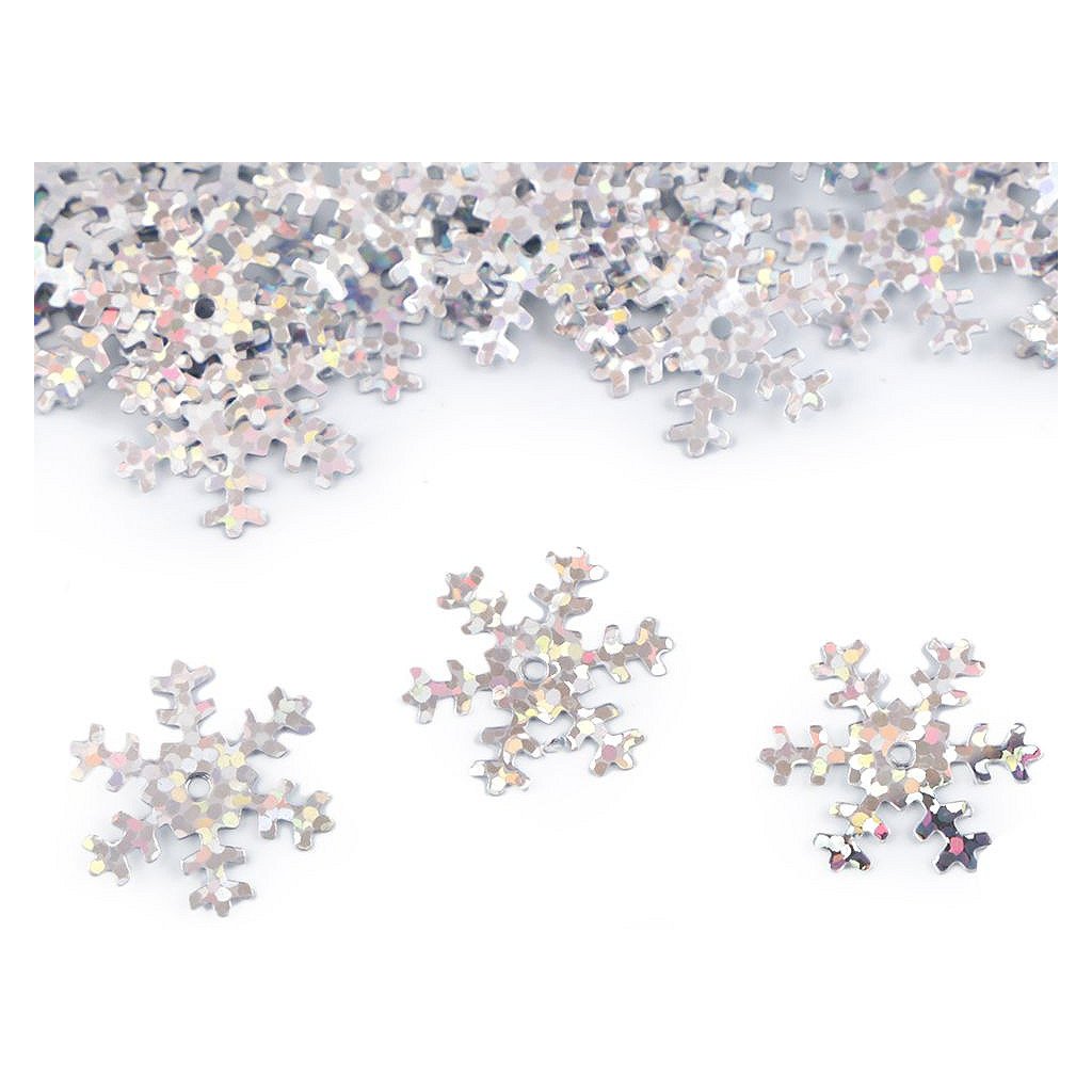 Hladké metalické flitry sněhové vločky. Vyniknou především u vánočních dekorací. Uprostřed mají otvor, jsou vhodné i na našití na oděvy a módní doplňky. Flitry s označením hologram se nádherně třpytí.