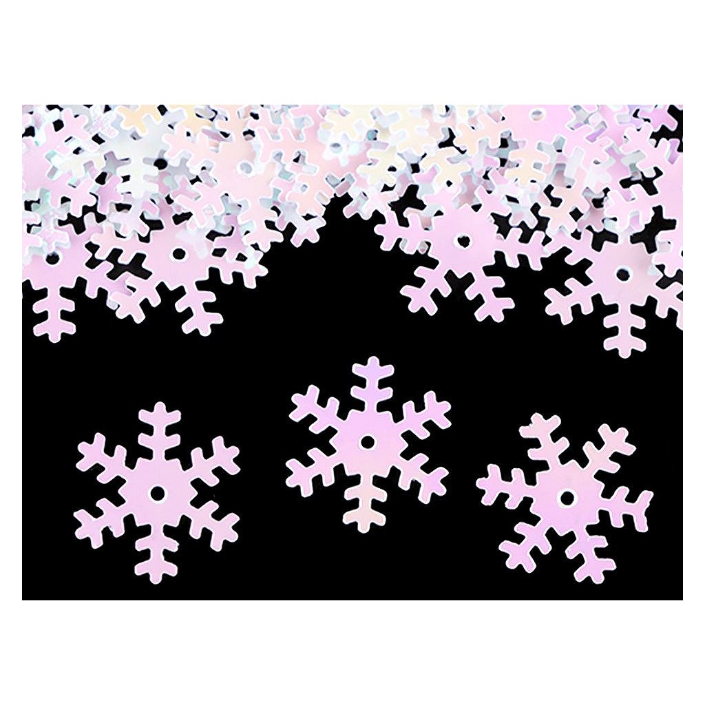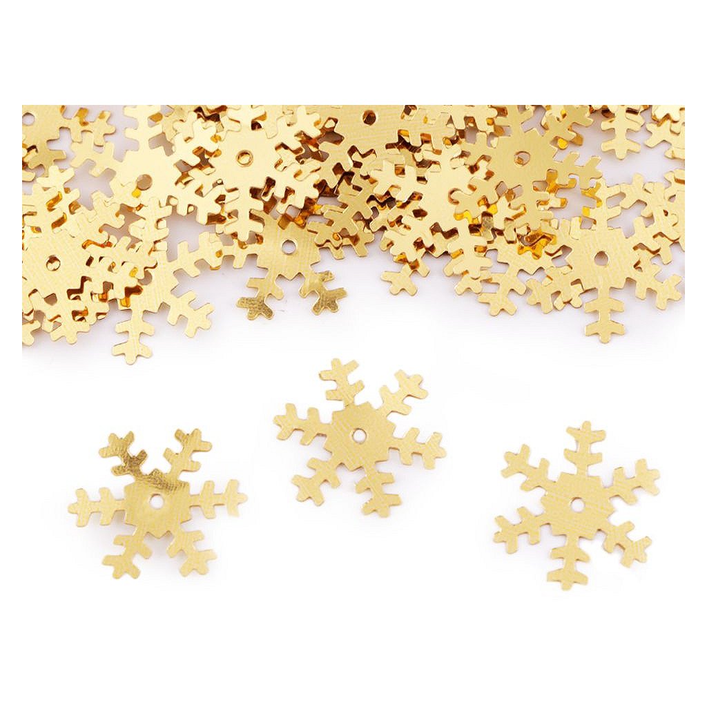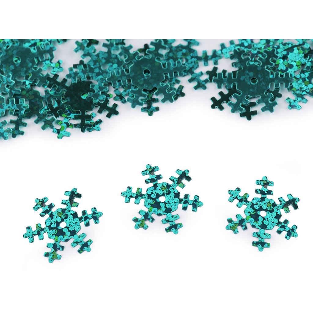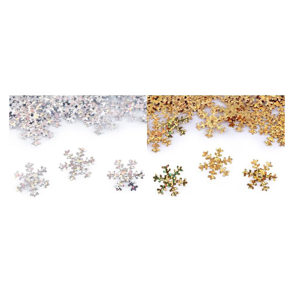 Hladké metalické flitry sněhové vločky. Vyniknou především u vánočních dekorací. Uprostřed mají otvor, jsou vhodné i na našití na oděvy a módní doplňky. Flitry s označením hologram se nádherně třpytí.