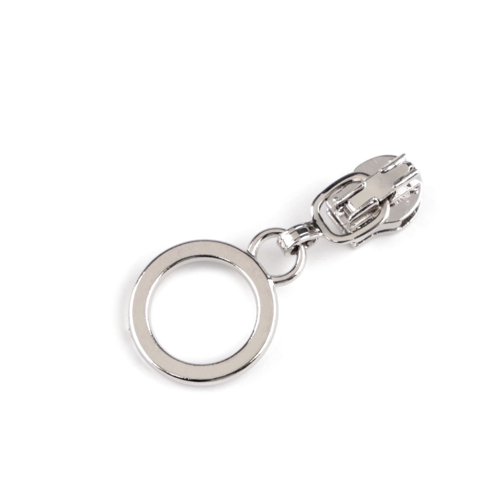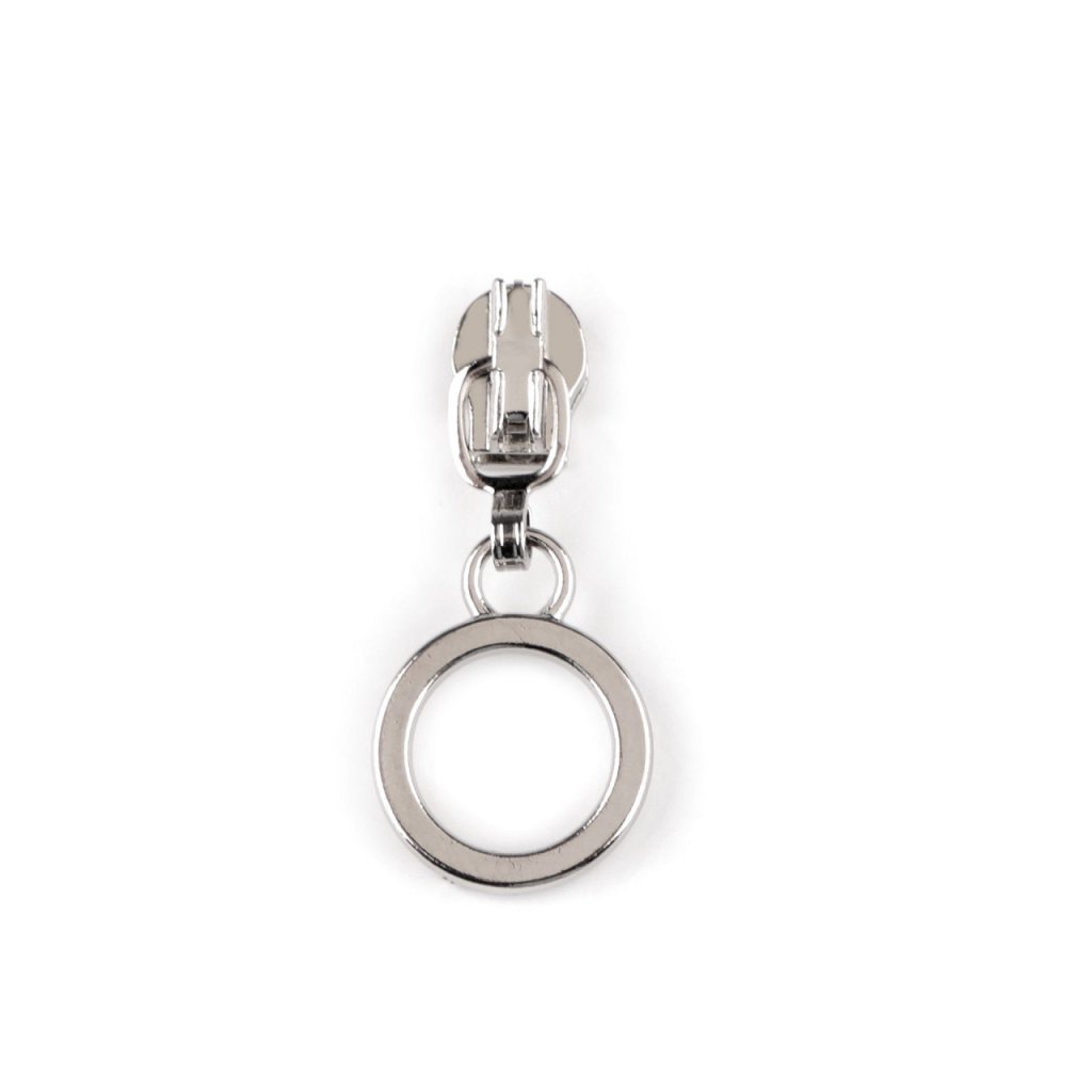 Kovový jezdec s táhlem ve tvaru kroužku je určený ke spirálovým zipům No 3 v metráži, které u nás najdete pod kódy 560600, 050716, 060714, 900594, 750678.