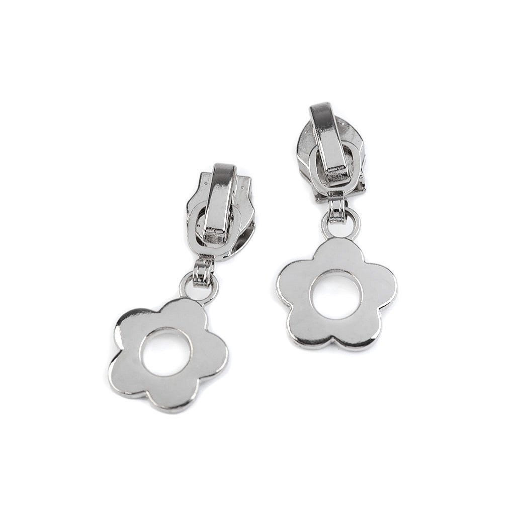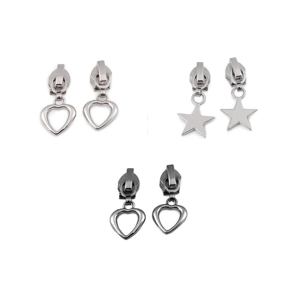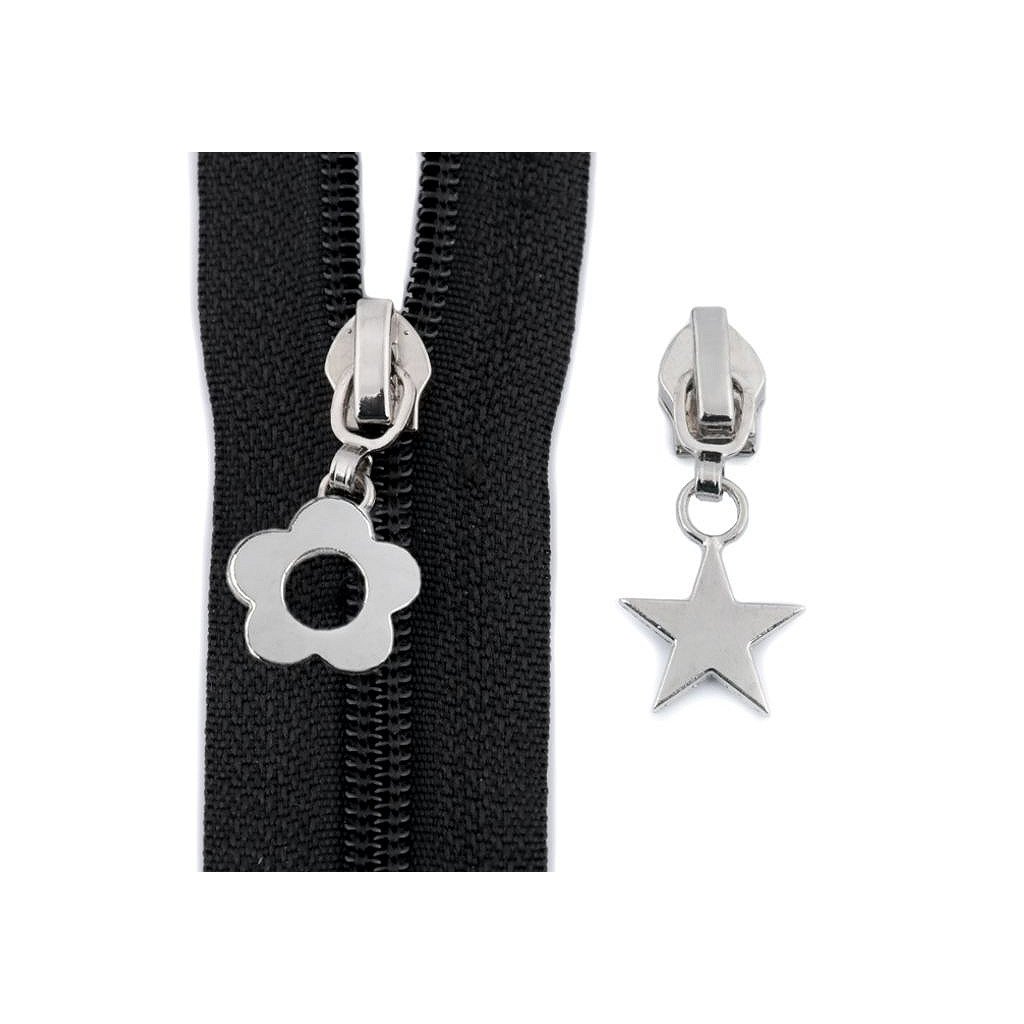 Kovový jezdec má táhlo s designem srdíčka, hvězdy nebo květu. Je určený ke spirálovým zipům, které najdete pod kódem 800963, 790304, 750503. Můžete ho využít nejen na oděvy, ale také na výrobu tašek a kabelek.