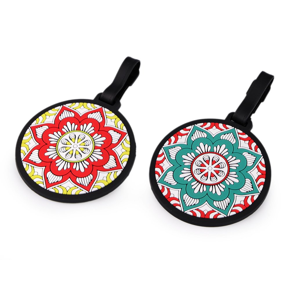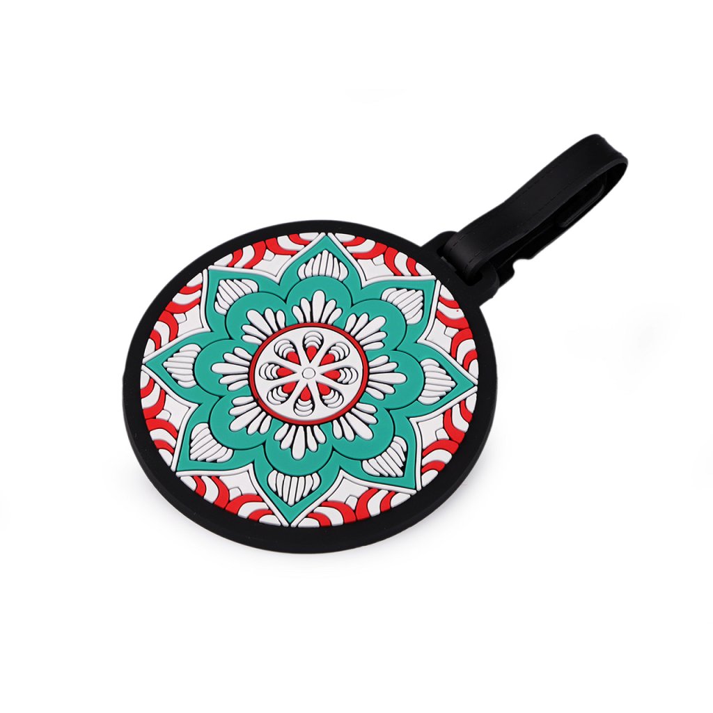 Nepřehlédnutelná kulatá jmenovka na kufr je na jedné straně ozdobená motivem mandaly. Usnadní hledání vašeho kufru ve velkém množství zavazadel. Je silikonová, ohebná. Do příslušných kolonek, které jsou umístěné na druhé straně, můžete napsat základní údaje jako je jméno, adresa, telefon, popř. e-mail. Součástí visačky je i pásek na přichycení. Kartička na vepsání údajů se dá vysunout, je chráněná pevnou transparentní fólií. Rozměry psací části jsou 3,2 x 4,6 cm.