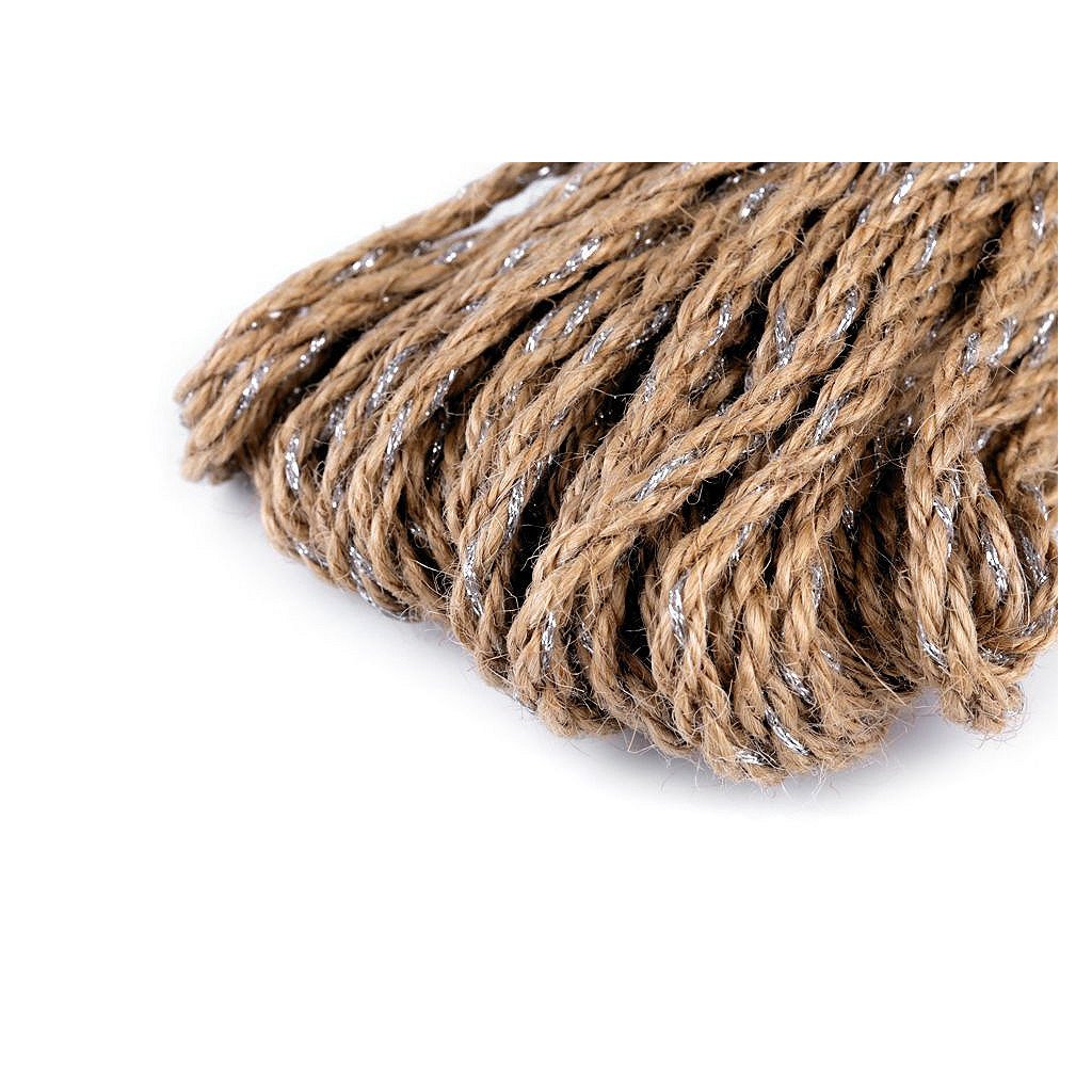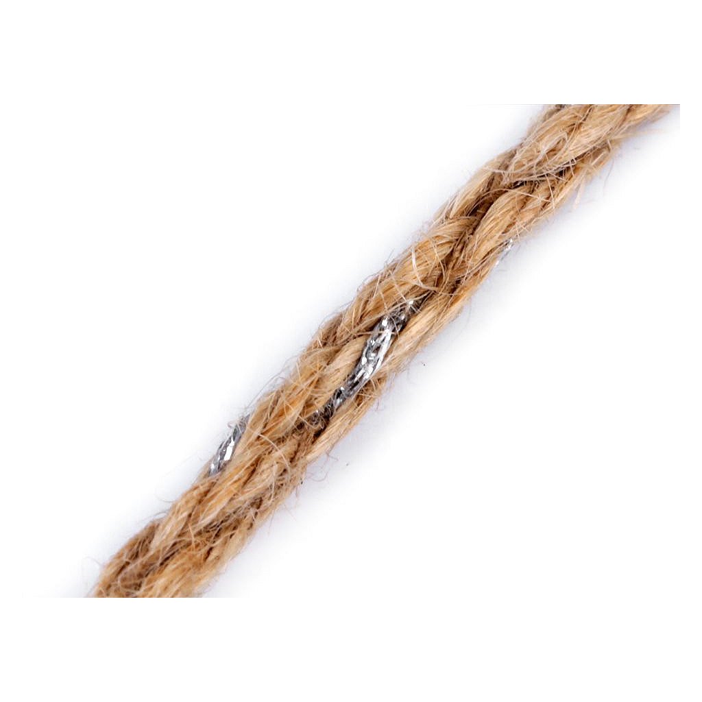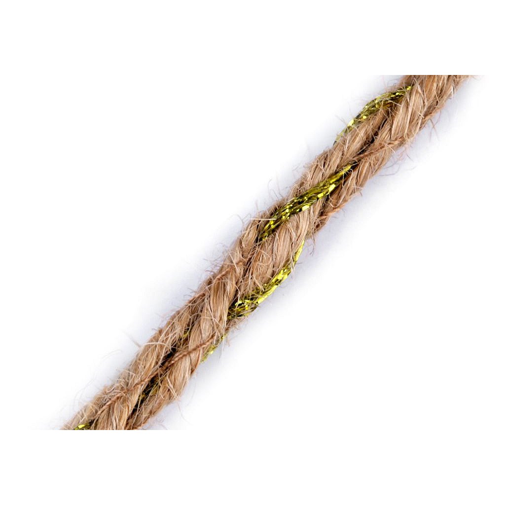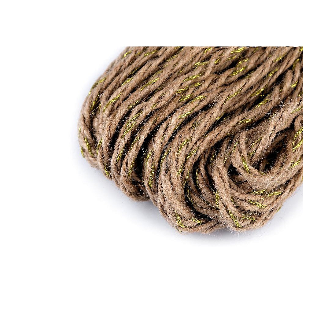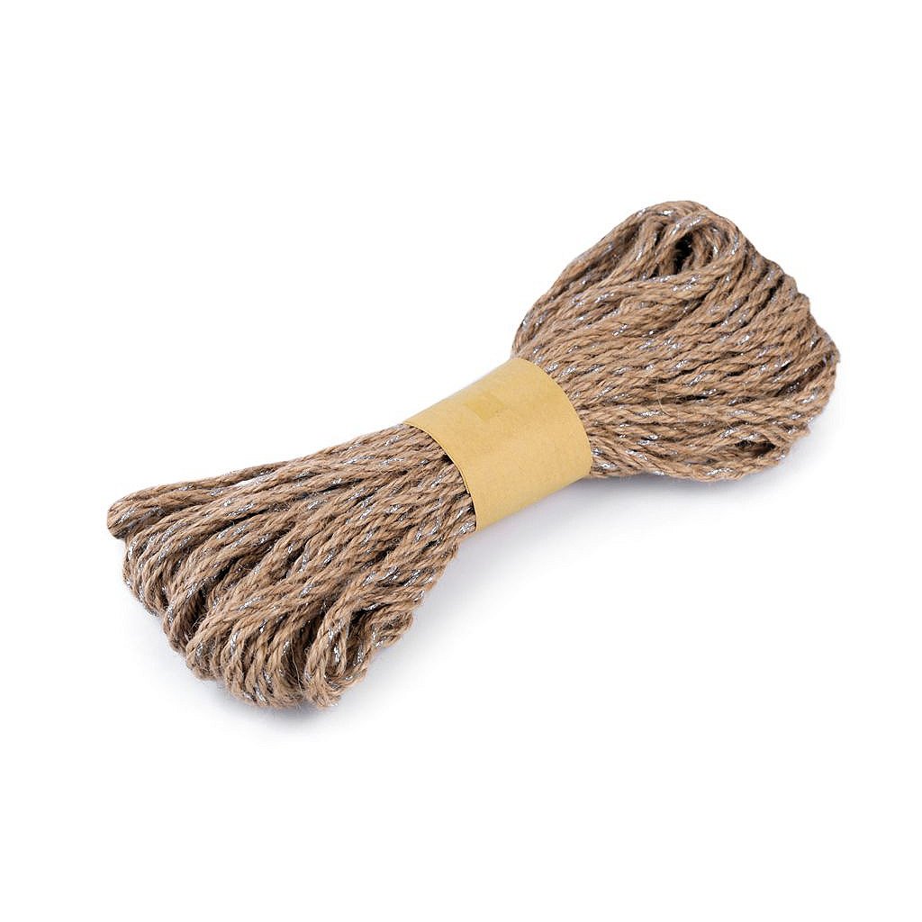 Splétaná jutová šňůra je pevná, spletená ze tří tenčích šňůr a protkaná třpytivým lurexem.