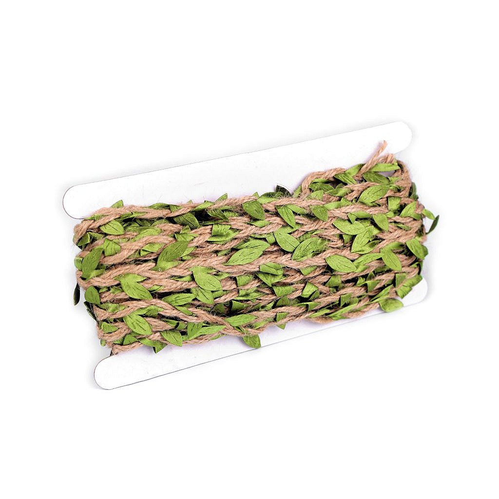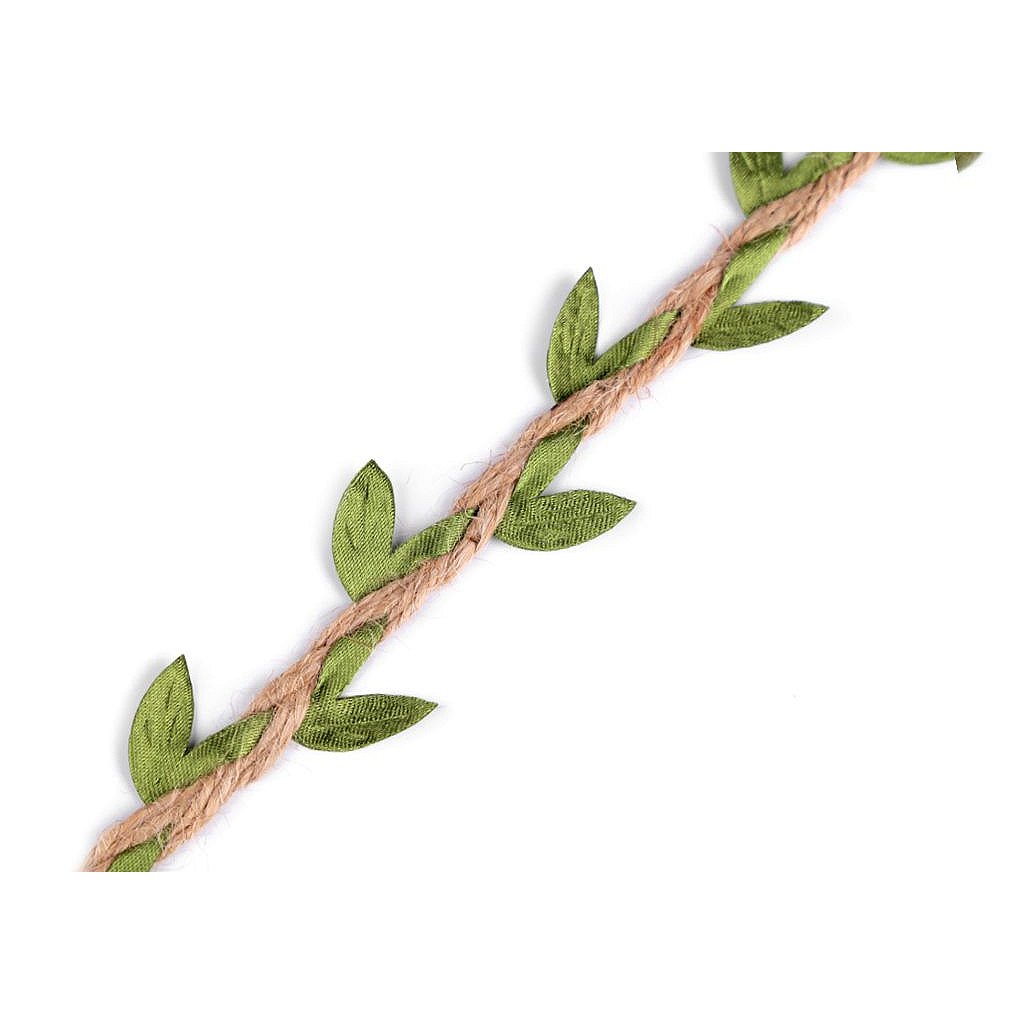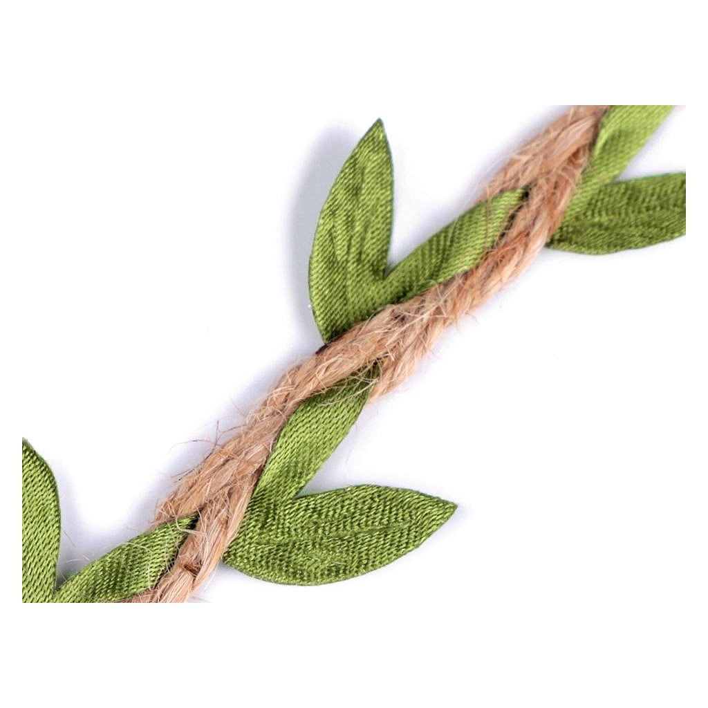 Jutový prýmek s lístečky je vhodný k šití i k dekorování. Stuha s listy je do prýmku zapletena, tím zajišťuje pravidelnost. Listy mají uprostřed vytlačené žilkování.
