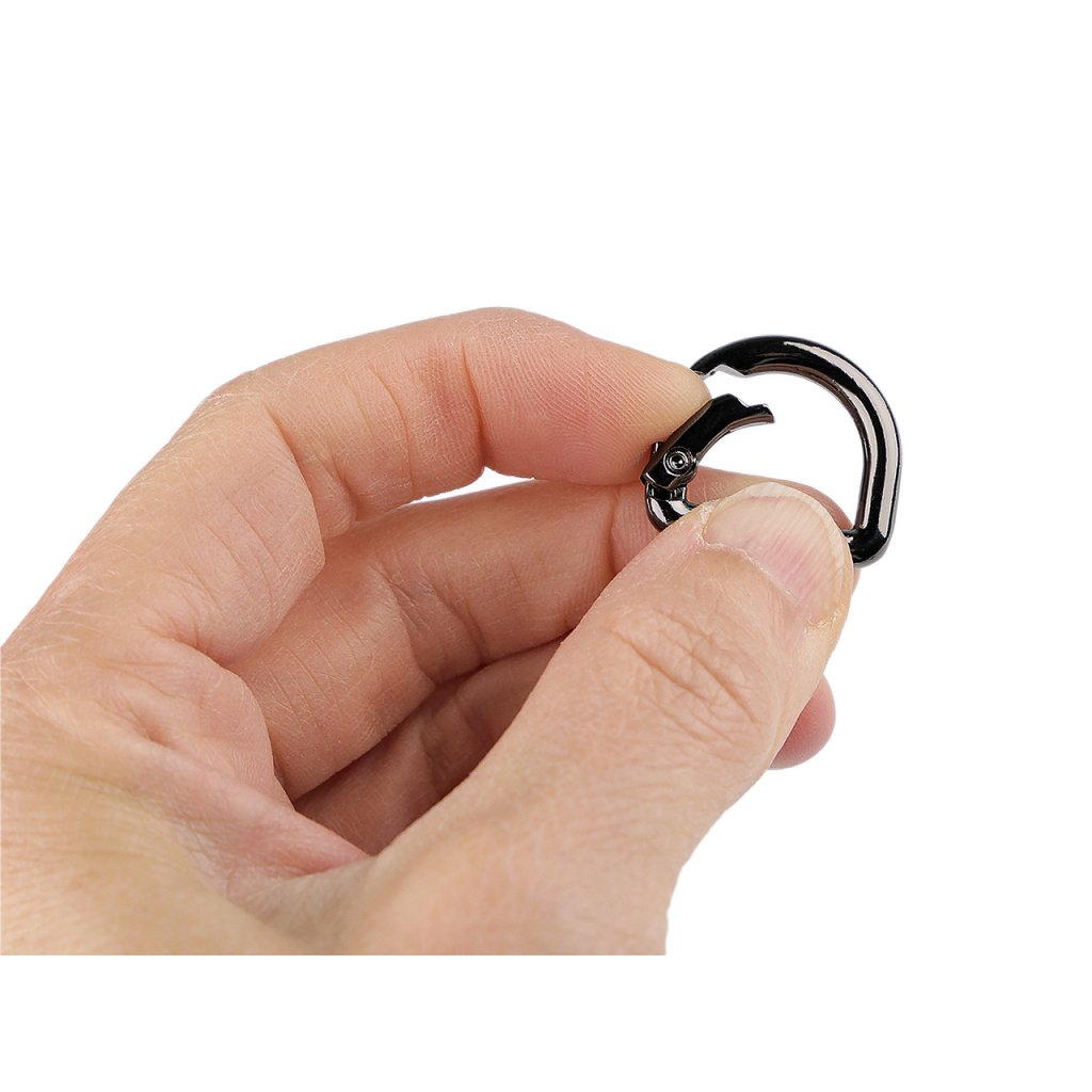 Malá karabina ve tvaru polokroužku vám poslouží na připevnění přívěsků ke kabelce, batohu či k tašce apod. Můžete ji použít jako klasickou karabinu nebo polokroužek.
