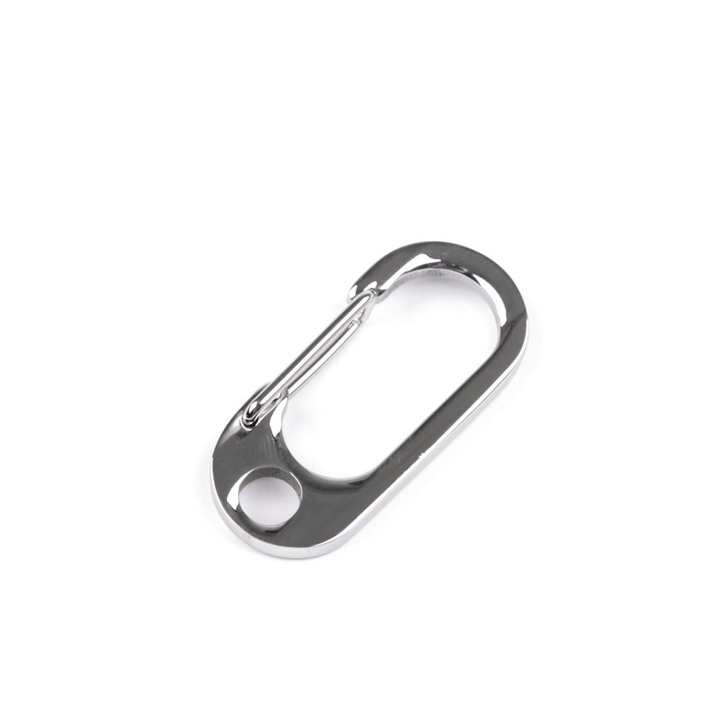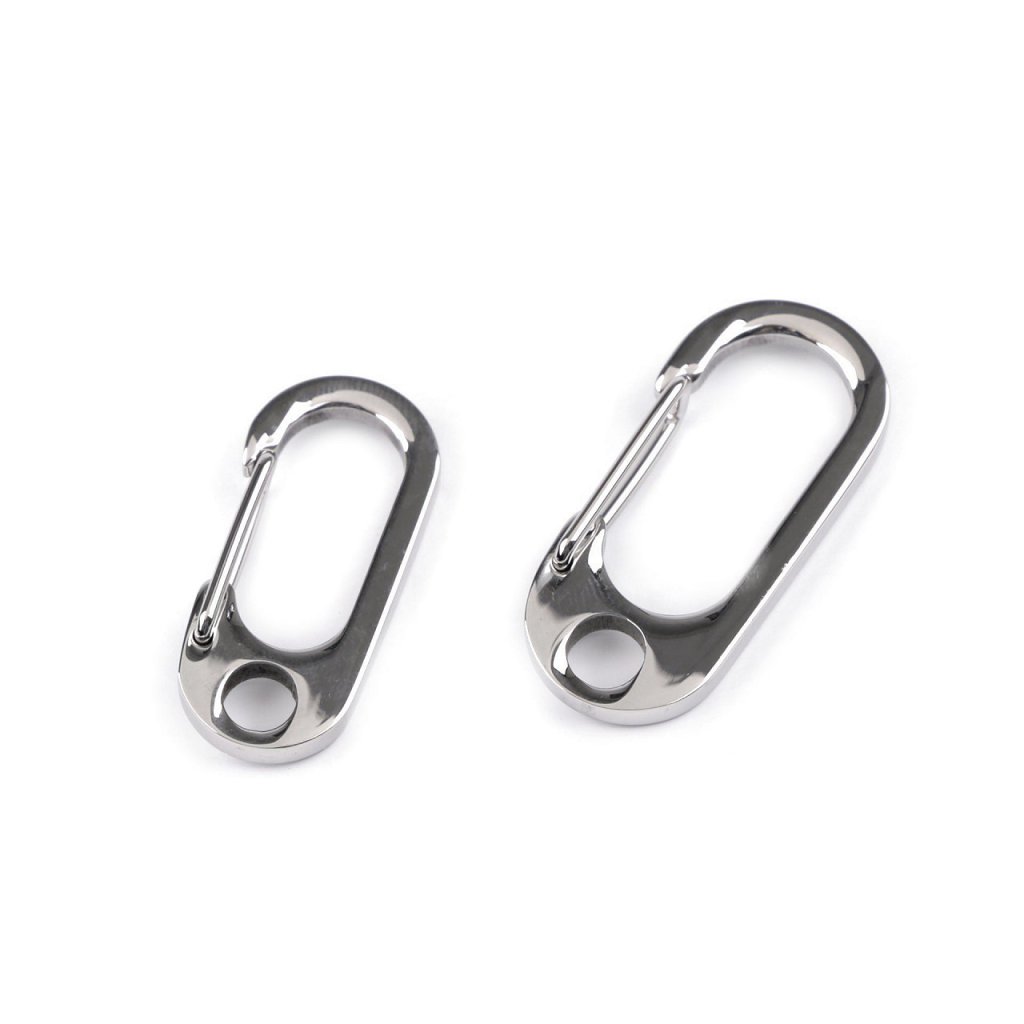 Kovová karabina je vyrobená z kvalitní nerezové oceli. Je masivní, pevná, vhodná k výrobě klíčenek a popruhů na tašky, kabelky či batohy. Dole má kulatý průvlek 6 mm.