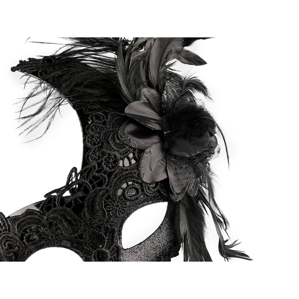 Karnevalová škraboška vám dodá tajemný a svůdný vzhled. Využijete ji na různé večírky, plesy, párty, karnevaly apod. Škraboška je celá pokrytá třpytivými glitry a doplněná elegantní krajkou. Její prodloužený bok zdobí textilní květ a peří.