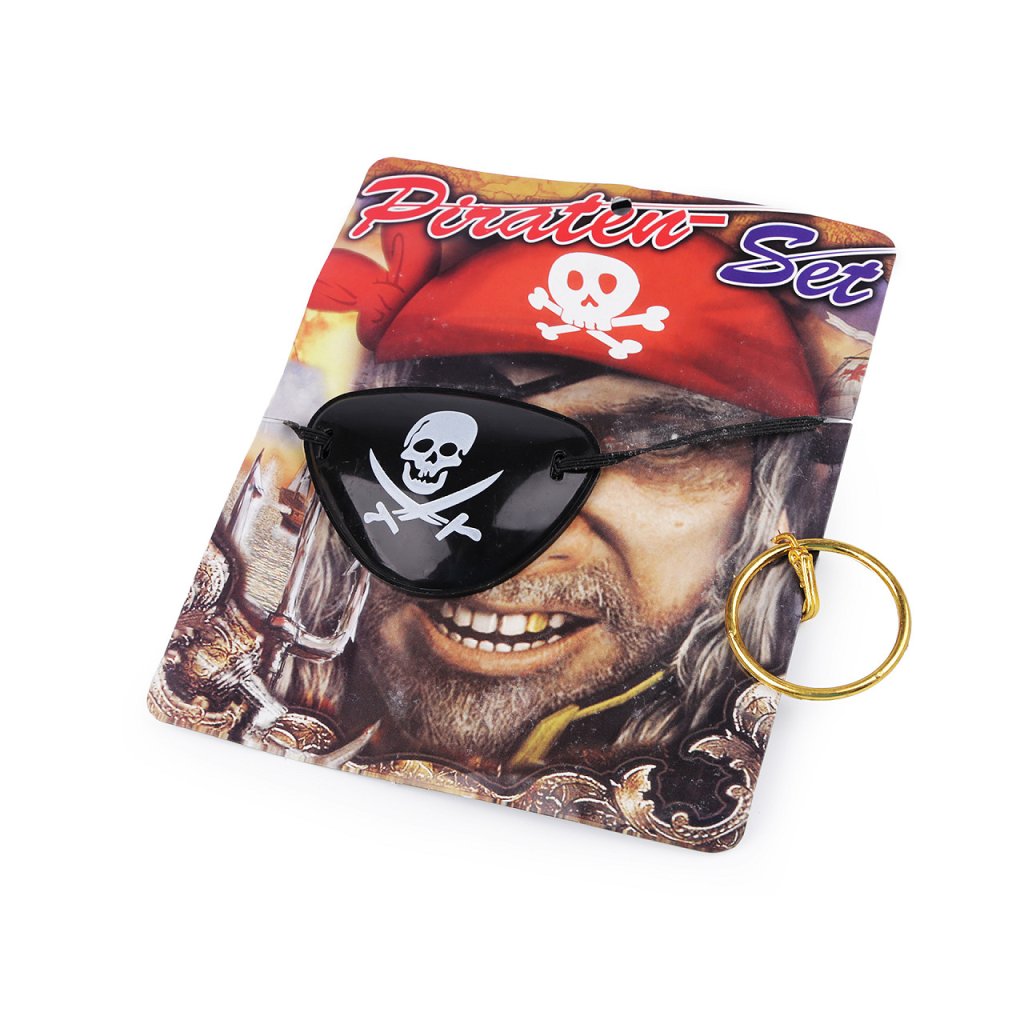 Pirátská karnevalová sada obsahuje plastovou pásku přes oko, šátek na hlavu a připínací zlatou náušnici. Je skvělá na karnevaly, oslavy, Halloween i tématické párty.