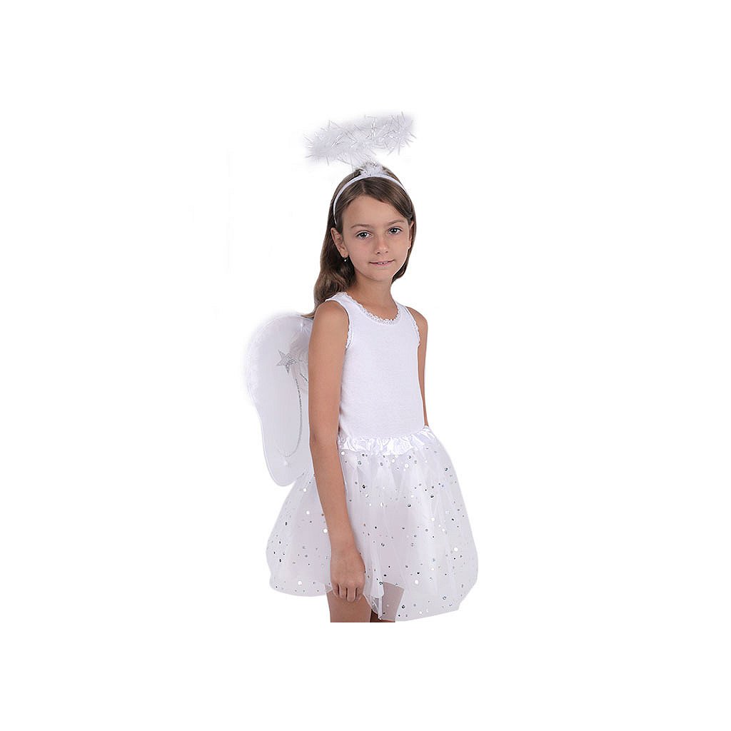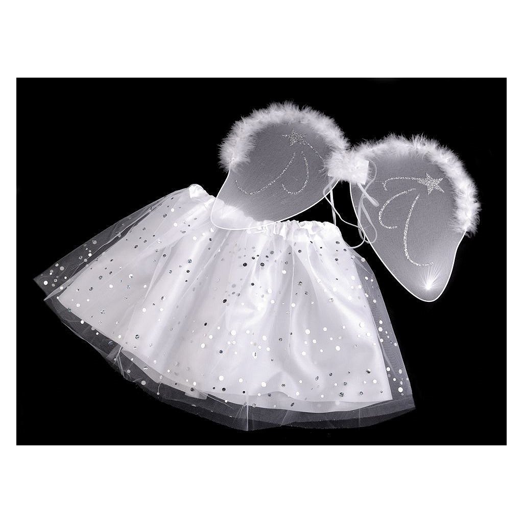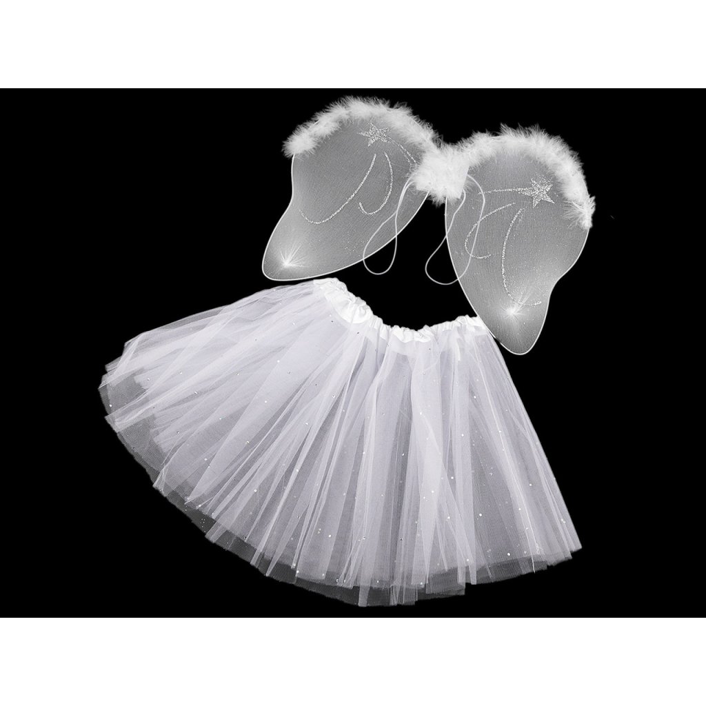 Kostým anděla se skládá z tylové sukýnky a křídel, která jsou vyztužená a nasazují se pomocí gumiček. Rozměry křídel jsou 32 x 43 cm, délka sukně je 32 cm, obvod pasu je 48 - 80 cm.
