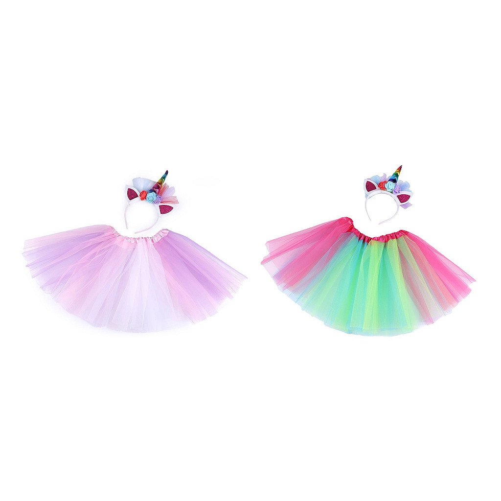 Kostým se skládá z tylové sukýnky a čelenky, na které je duhový roh, uši s glitry a pěnové květy.