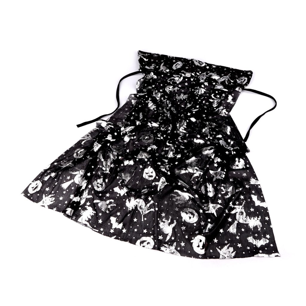Karnevalový plášť má efektní metalický potisk. Promění vaše dítko v čaroděje, ježibabu, kouzelníka a podobné strašidelné postavy. Váže se pomocí šňůrek. Materiál je poloprůhledný.