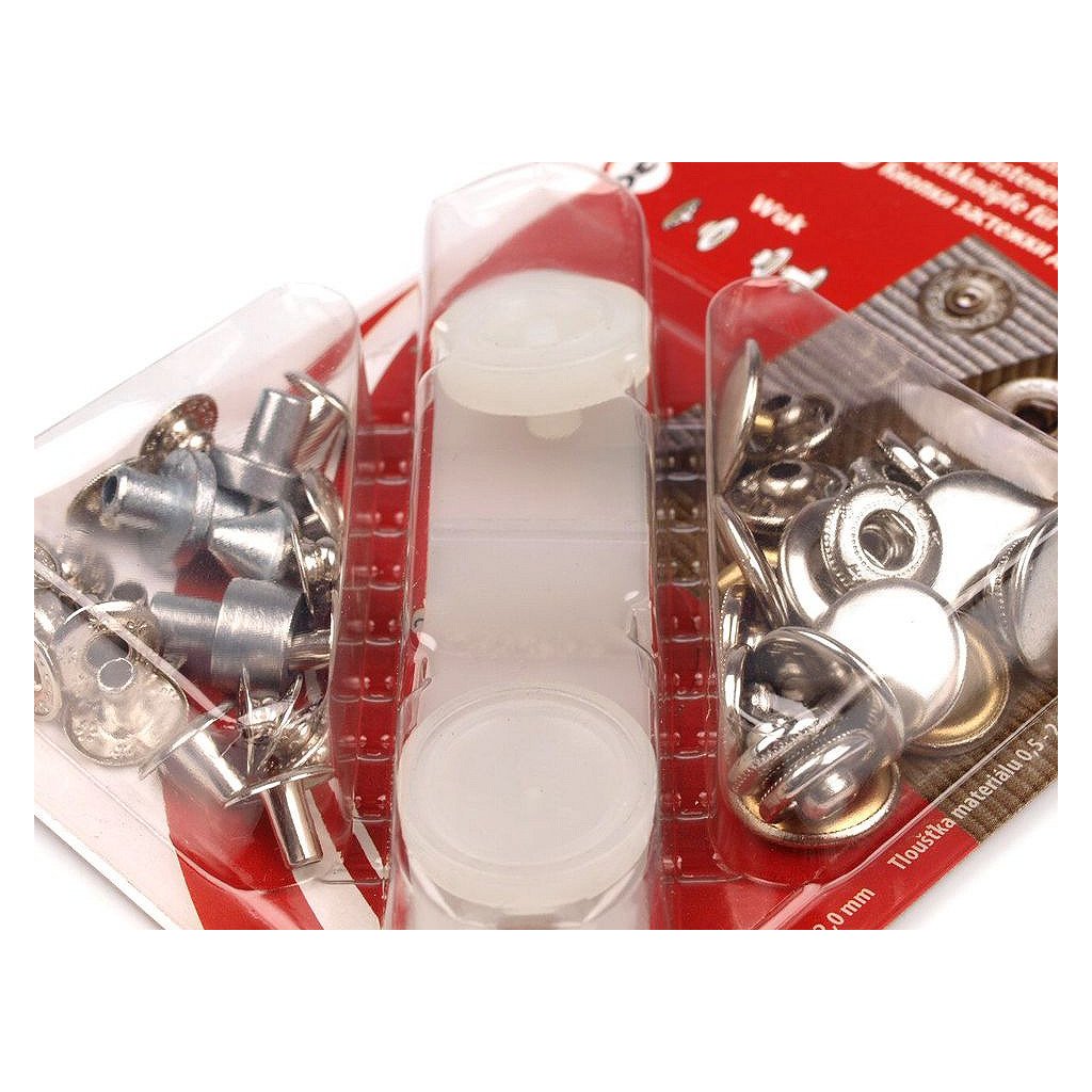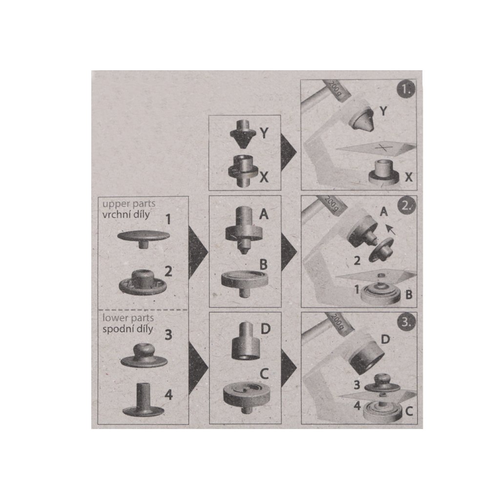 Stiskací knoflíky s označením "wuk" jsou určeny ke spojování středně silných látek o tloušťce 0,5 - 1,5 mm. Nýtování se provádí plastovým mini lisem, který je součástí balení. Knoflíky nereziví.