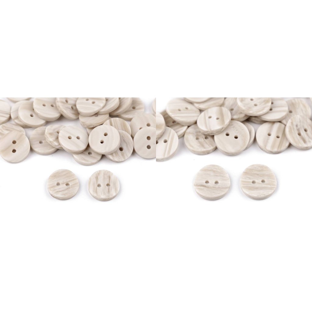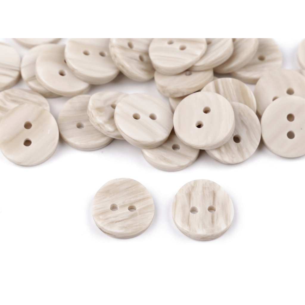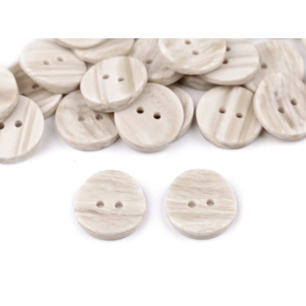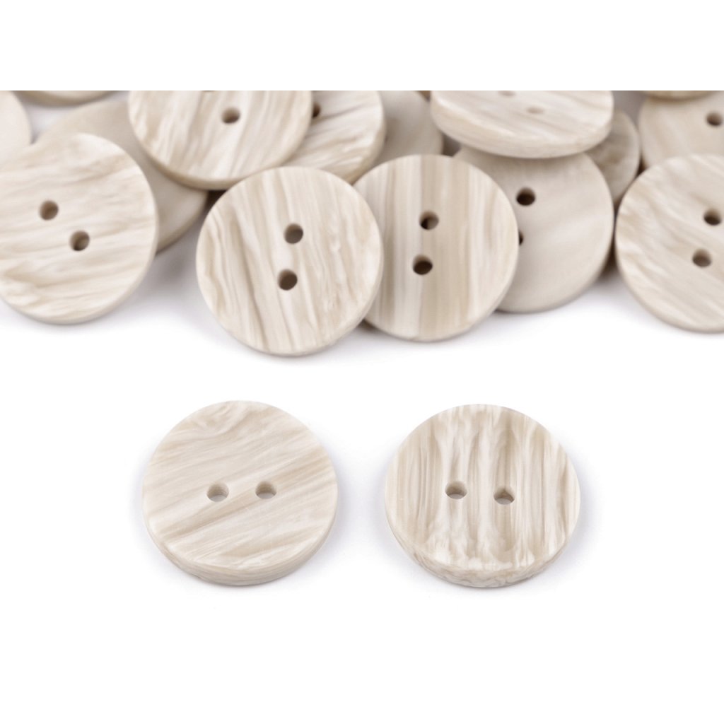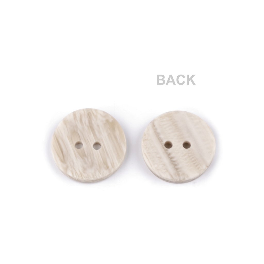 Dvoudírkové knoflíky mají zajímavý design - z rubové strany jsou rovné, z lícové strany jsou lehce vypouklé směrem dovnitř. Zabarvením imitují světlé dřevo. Vyniknou na svetrech, vestách, sakách, bundách apod.