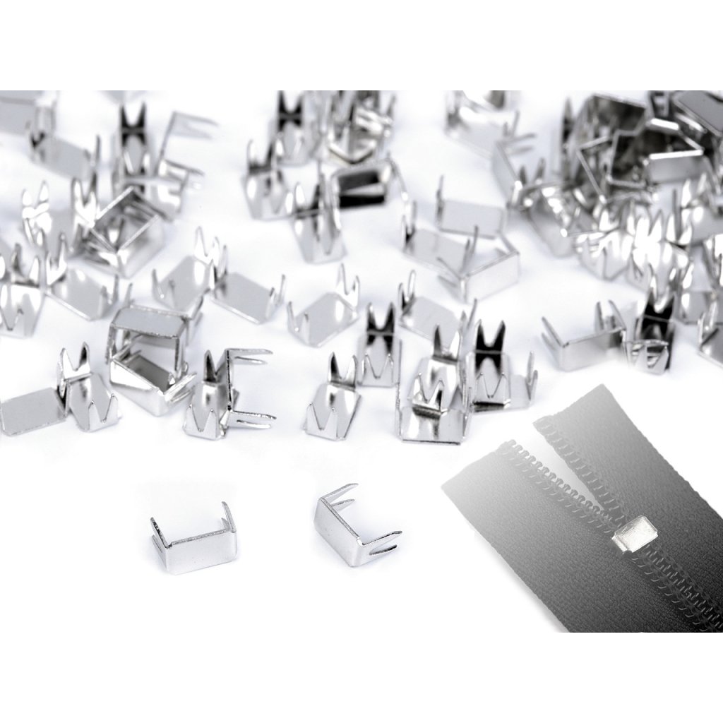 Kovová koncovka slouží k uzavření zipu, aby z něj nevyjel jezdec. Její aplikace je velmi snadná, stačí jen přimáčknout zoubky na zip pomocí kleští. Koncovka je vhodná na spirálovou a kostěnou metráž, kterou najdete pod kódy 050714 a 090847.