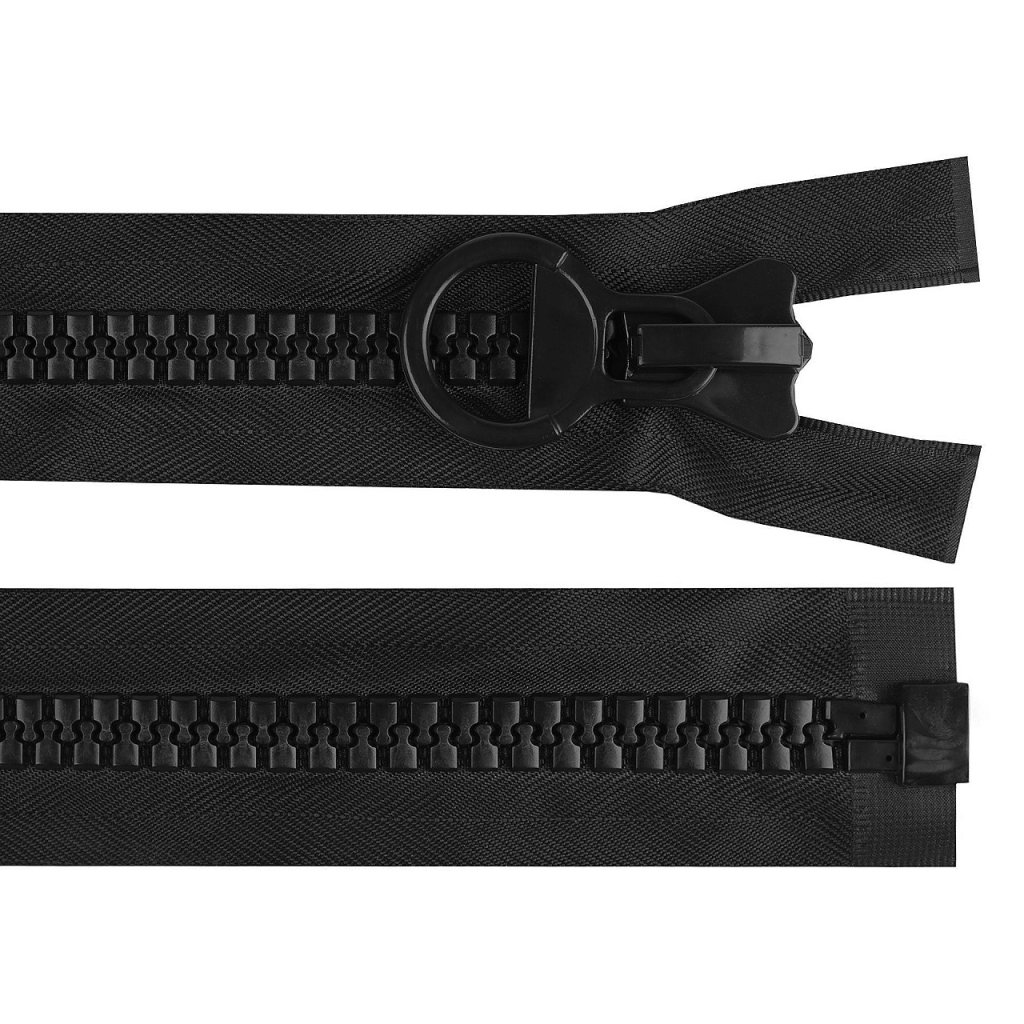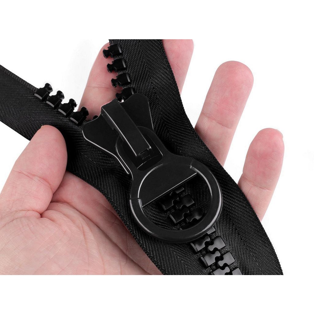 Kostěný dělitelný zip zaujme svou velikostí. Pokud rádi poutáte pozornost, můžete ho našít na mikiny, bundy apod. Zoubky jsou plastové. Efektní na zipu je i obrovský jezdec s kulatým táhlem.