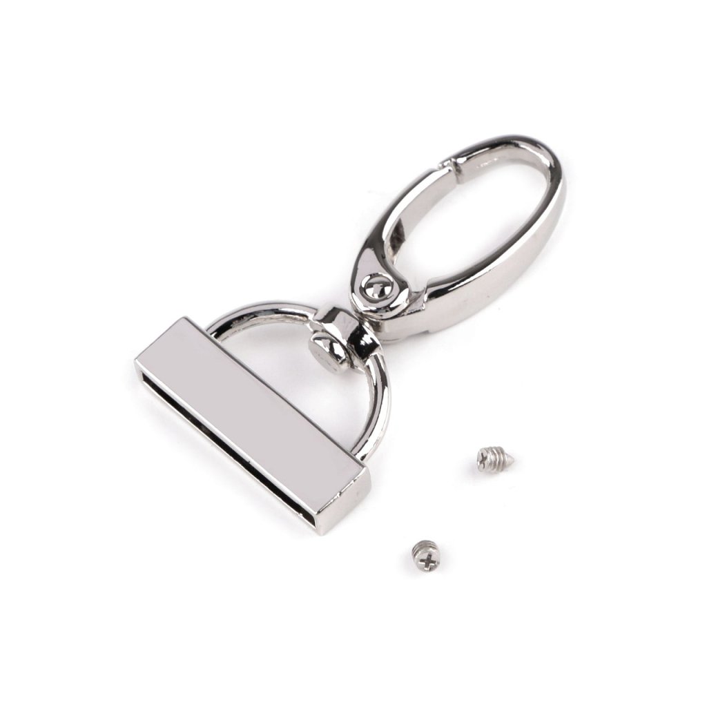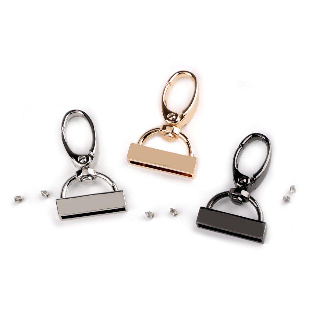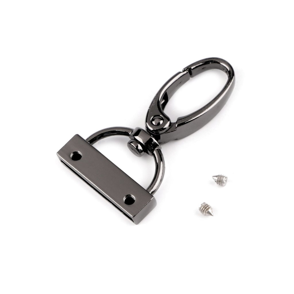 Kovová otočná karabina je s koncovkou, kterou pomocí drobných šroubků připevníte k popruhům či řemínkům. Skvěle se hodí na výrobu tašek, kabelek nebo klíčenek.