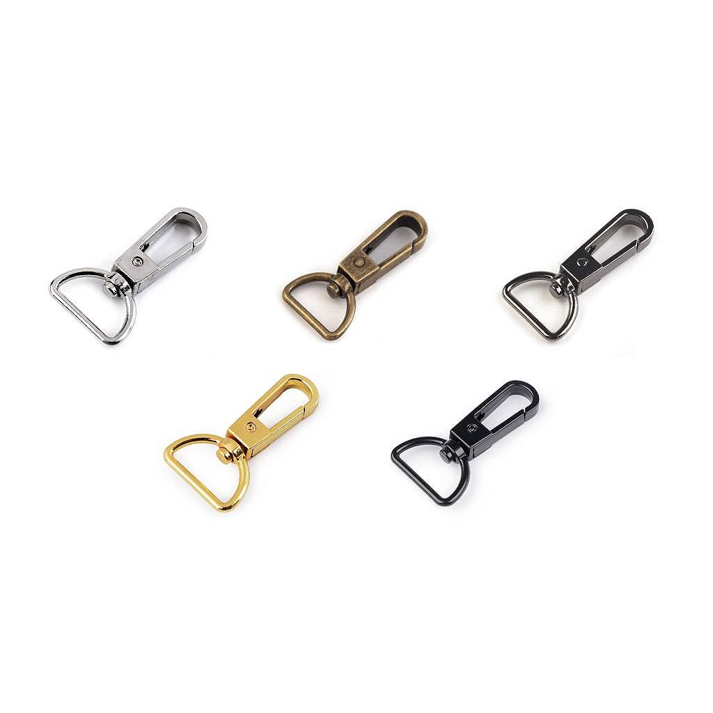 Kovová karabina je otočná. Využijete ji k výrobě klíčenek, vodítek pro psy nebo k připevnění popruhů na tašky a kabelky.