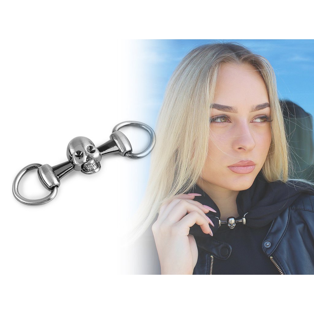 Kovová nerozevíratelná spona s lebkou je vhodná jako dekorační prvek pásků, kabelek, batohů, čepic, obuvi apod. Detaily lebky jsou pečlivě zpracovené, lesklé, dodávají sponě autentický a výrazný vzhled.