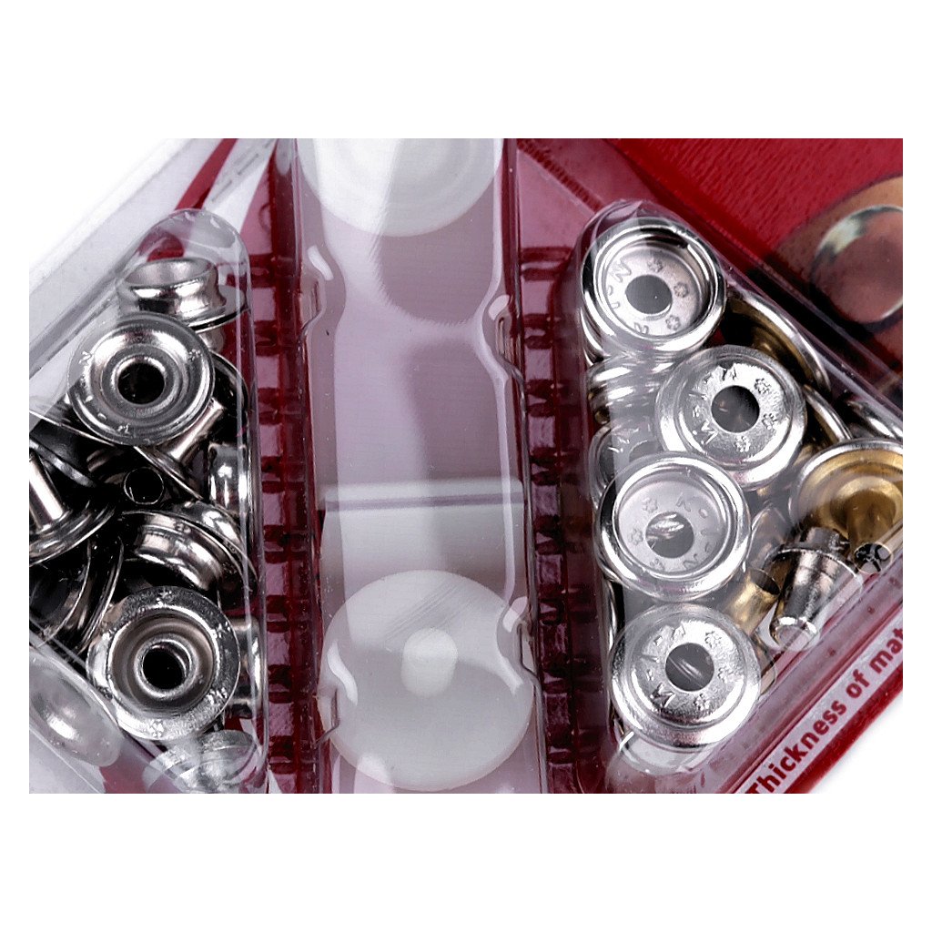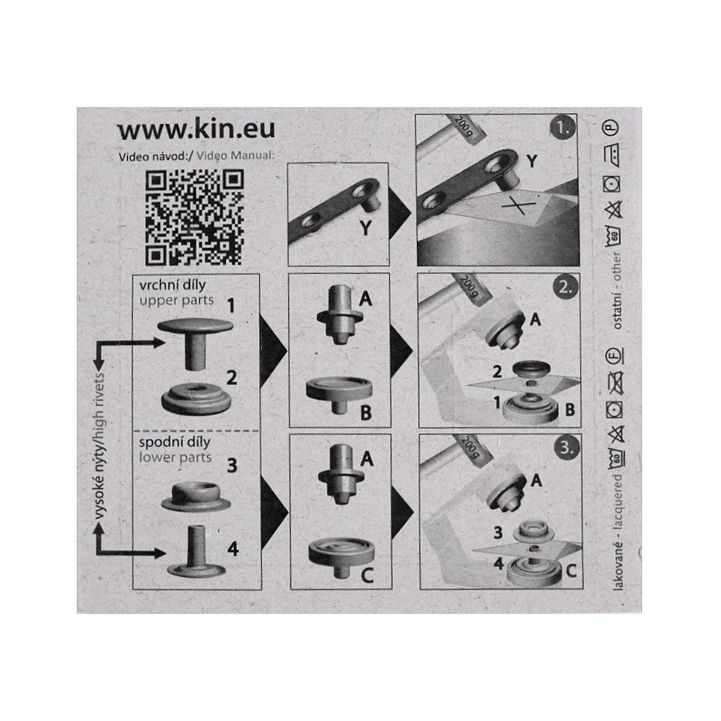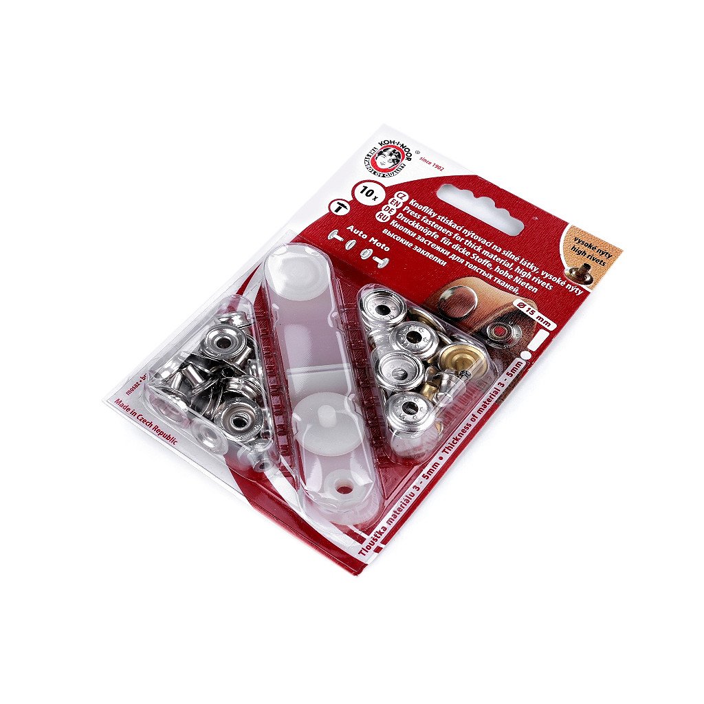 Stiskací knoflíky s vysokým nýtem jsou určeny ke spojování silných látek s tloušťkou 3 - 5 mm (ideálně na kůži a koženky). Nýtování se provádí plastovým mini lisem, který je součástí balení. Knoflíky nereziví.
