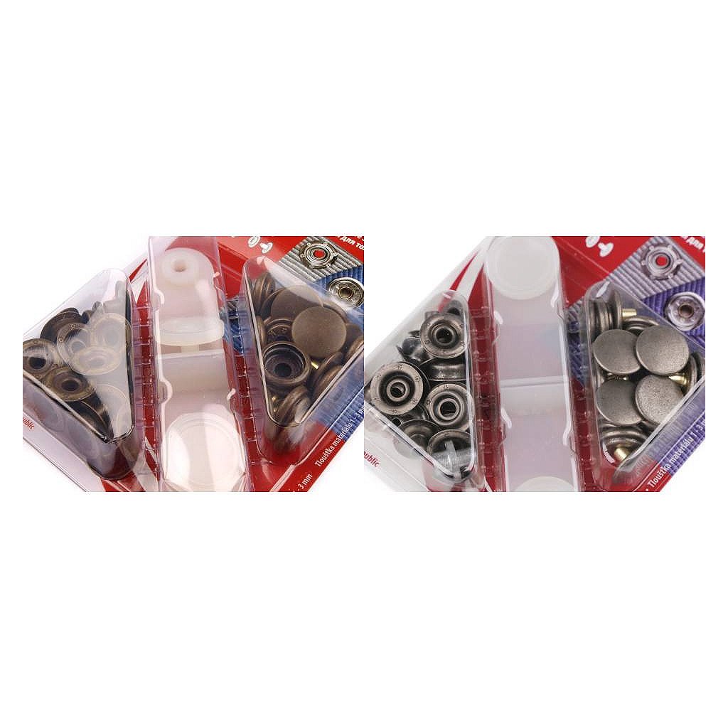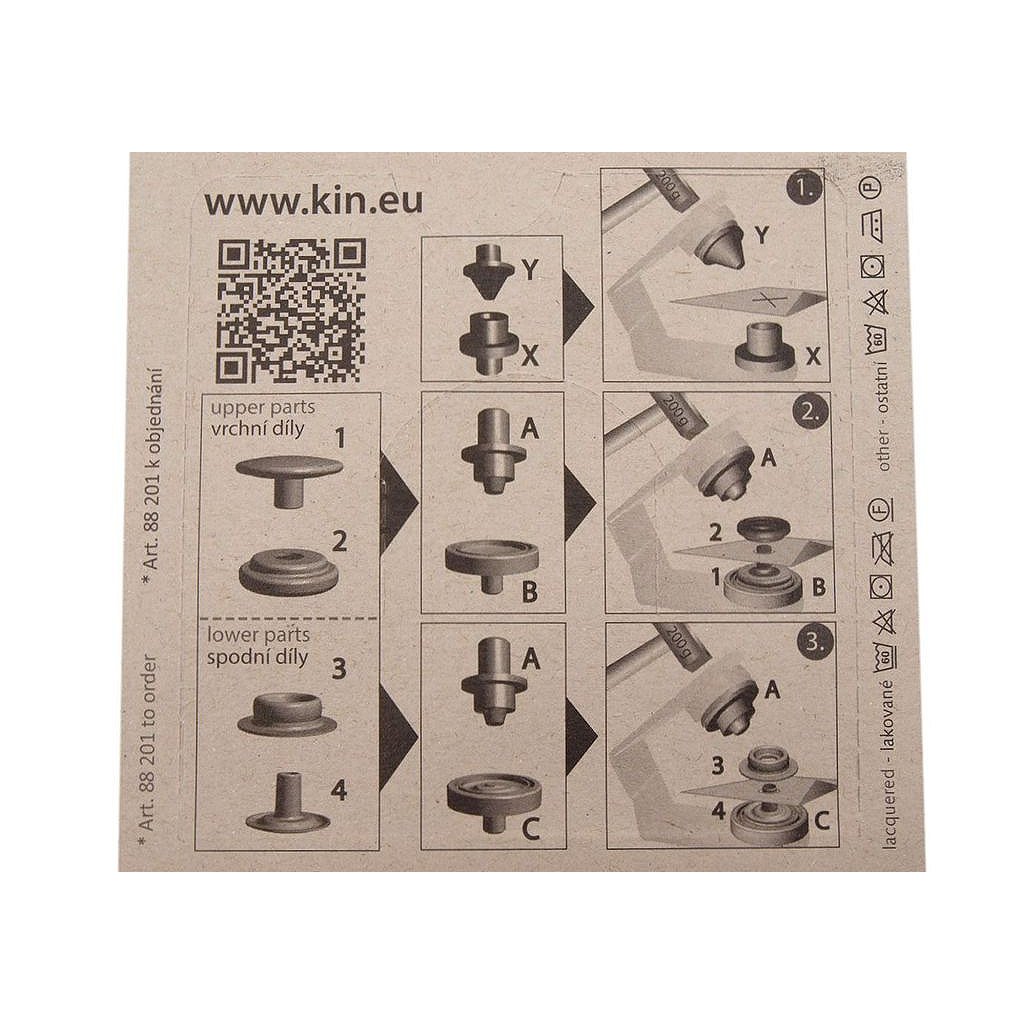 Stiskací knoflíky využijete ke spojování silnějších látek. Nýtování se provádí plastovým mini lisem, který je součástí balení. Návod na nýtování viz obrázek.