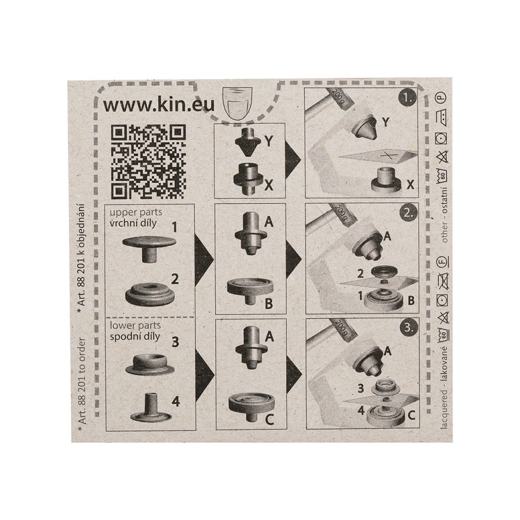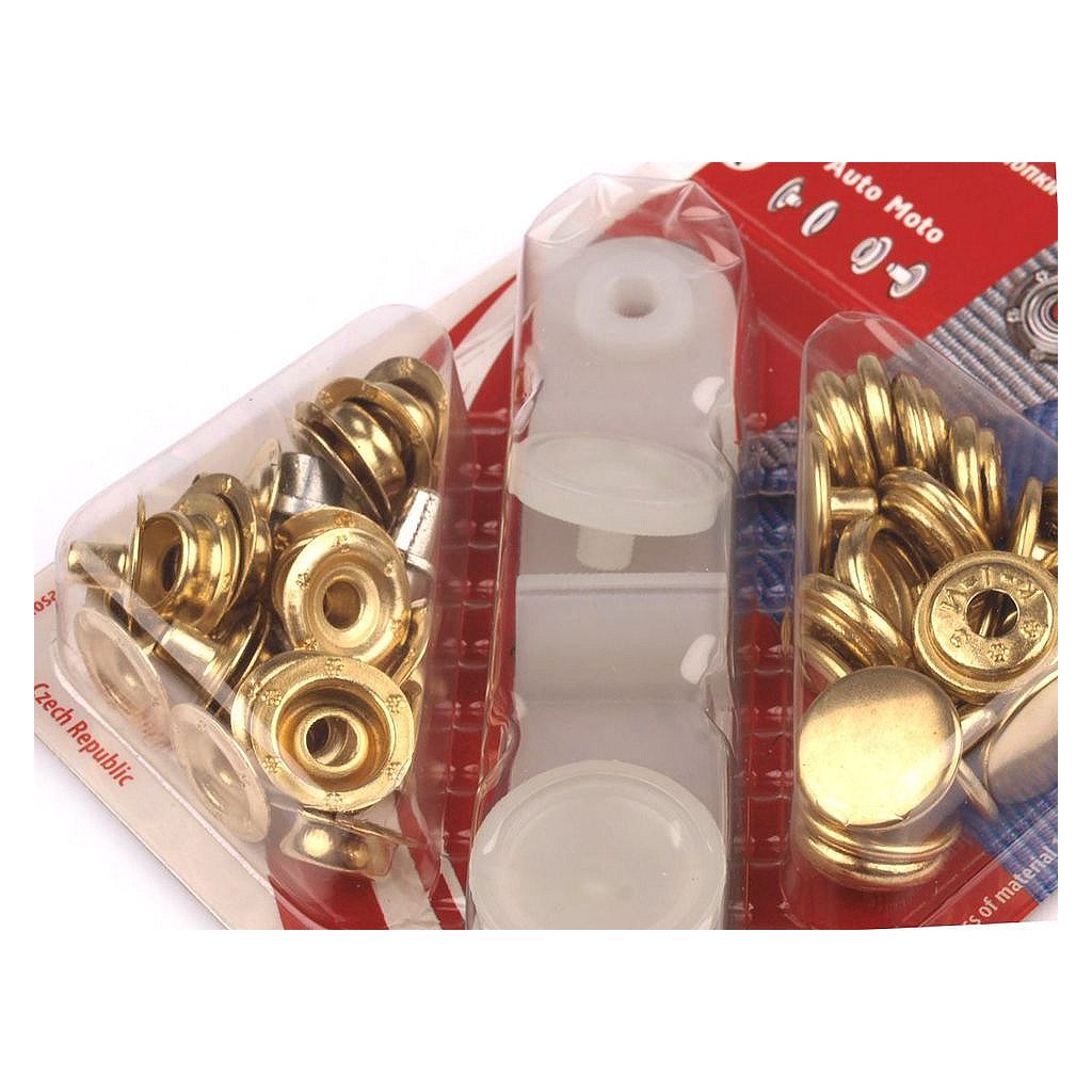 Stiskací knoflíky jsou určeny ke spojování silných látek. Nýtování se provádí plastovým mini lisem, který je součástí balení. Knoflíky nereziví.