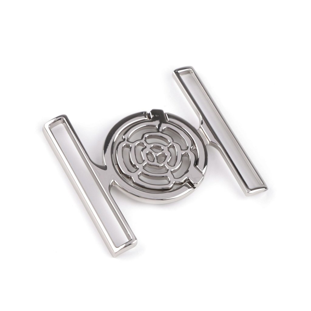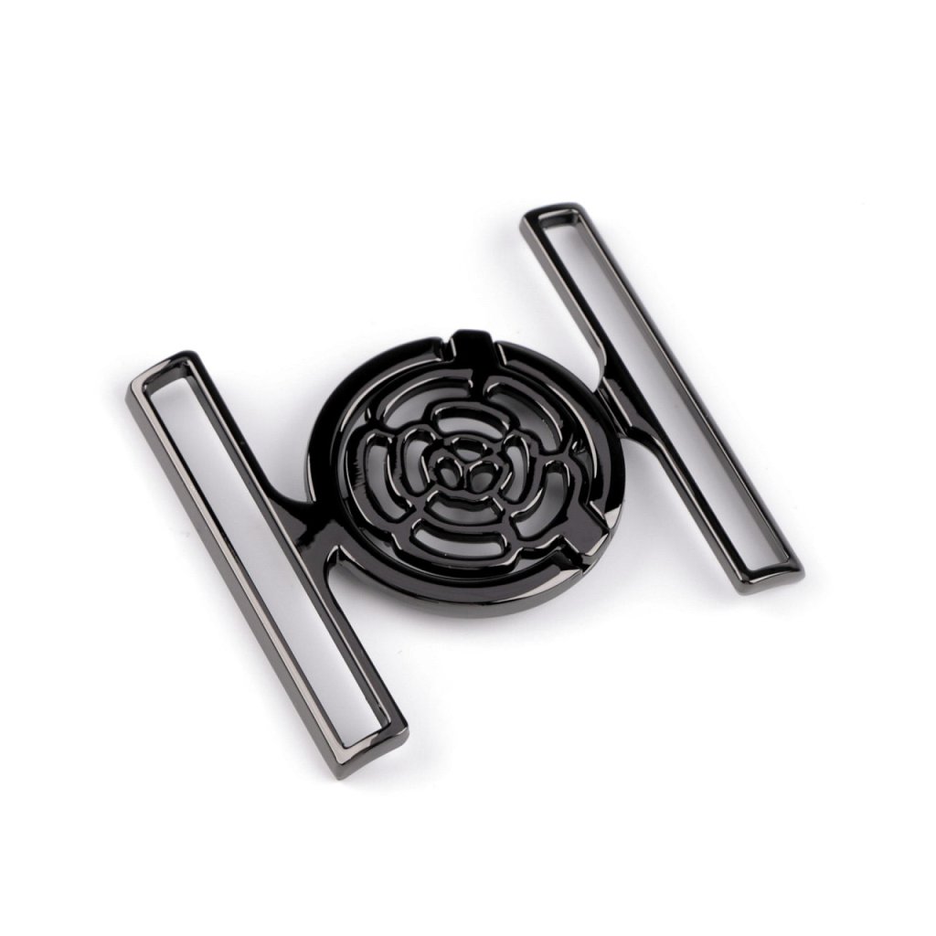 Kovová spona vyniká svým elegantním designem. Jednoduchý, avšak pevný mechanismus zapínání poskytuje spolehlivost a snadnou manipulaci. Spona je vhodná na výrobu opasků k šatům, sakům, kabátkům apod.
