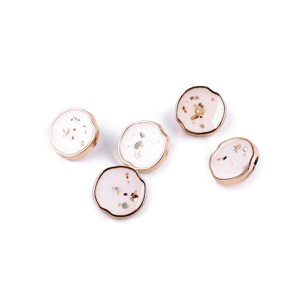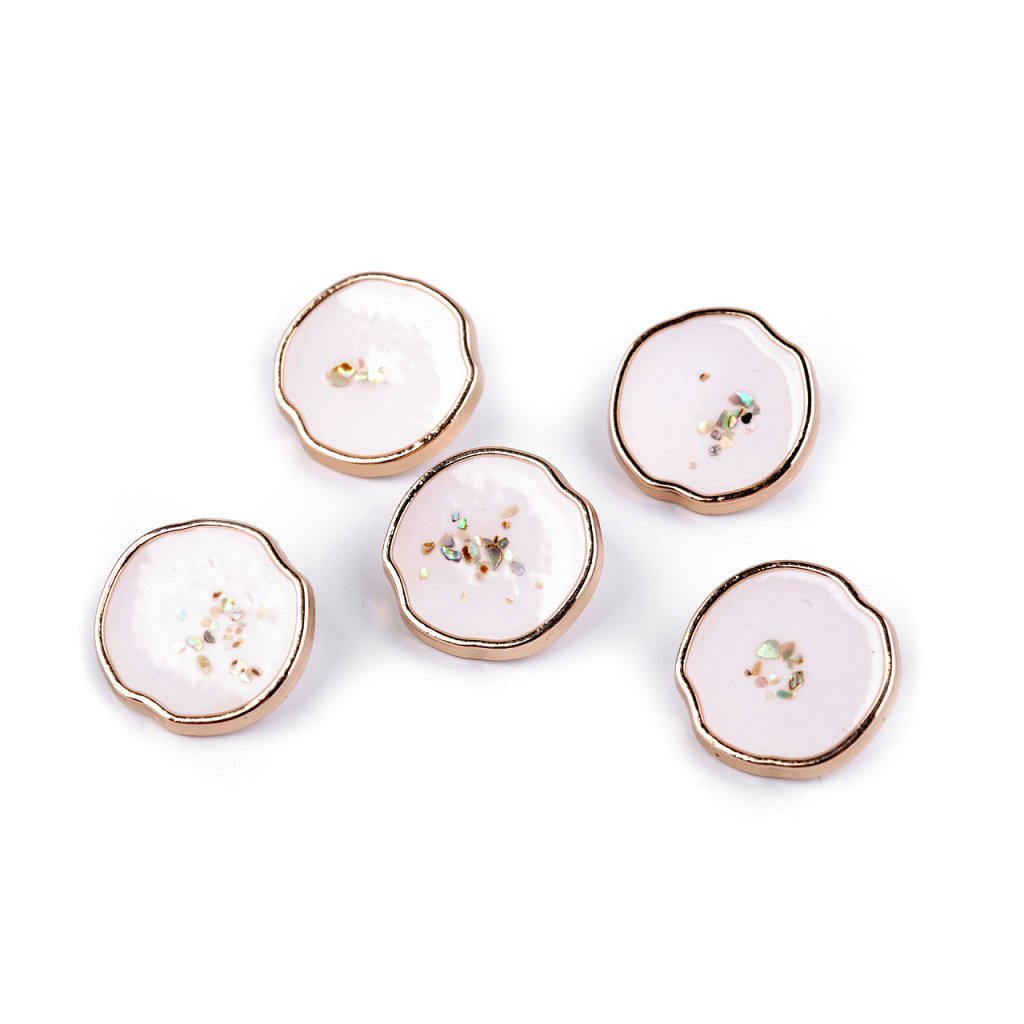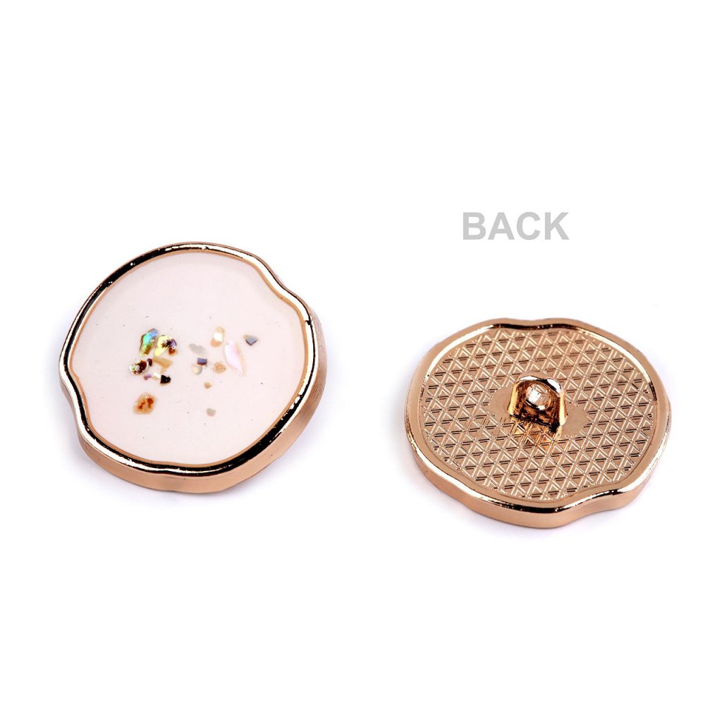 Luxusní kovové knoflíky zaujmou svým designem - mají nepravidelný kulatý tvar a naleznete v nich drobné kousky perleti zalité v pryskyřici. Vyniknou na košilích, svetrech, šatech, kabátech i taškách.