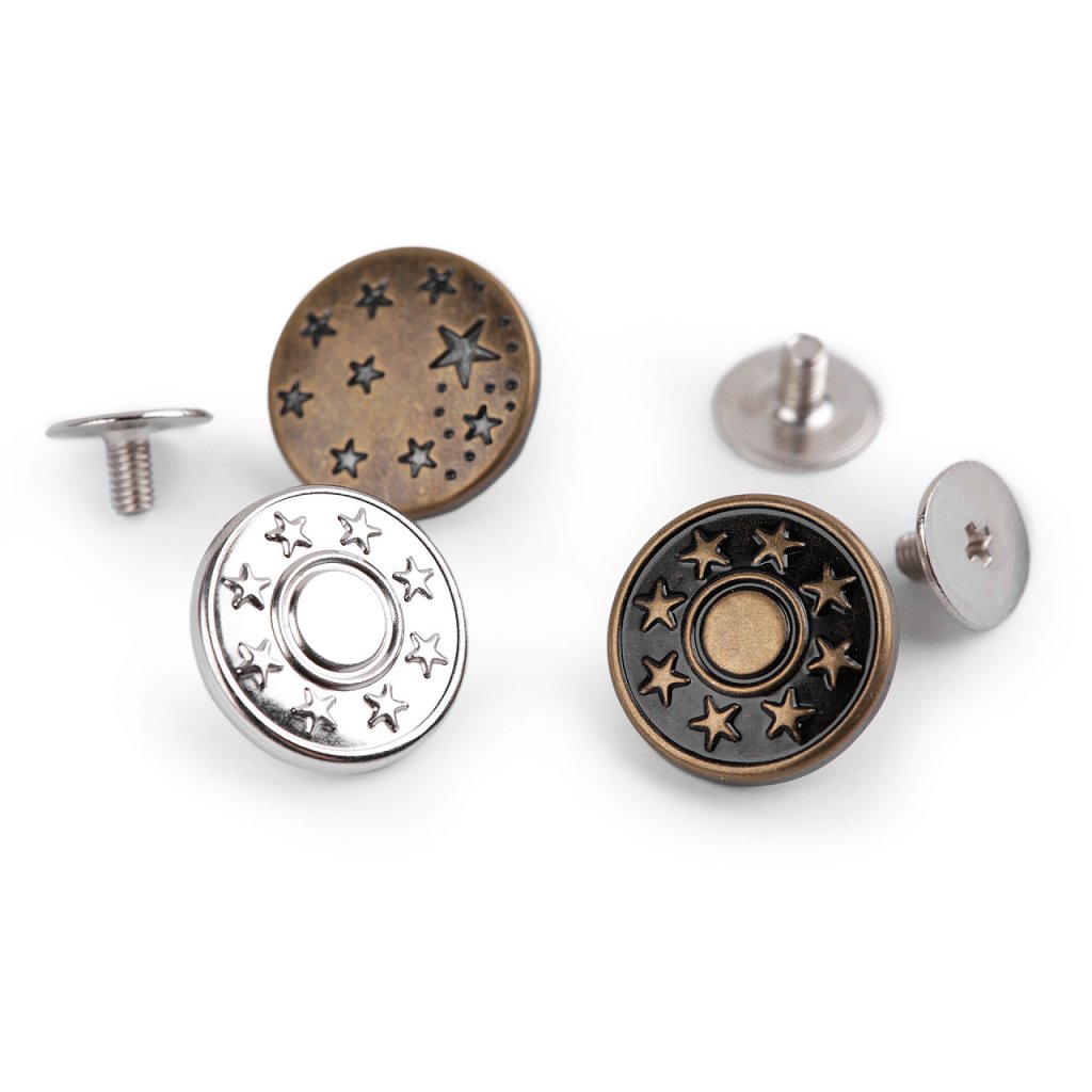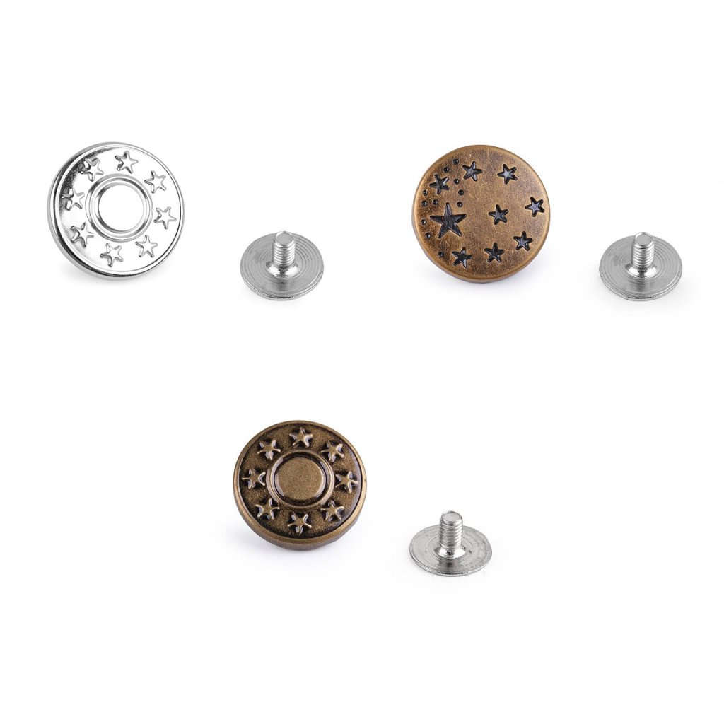 Kovový riflový knoflík je výjimečný tím, že se nenaráží, ale šroubuje, a tak vám ušetří práci i čas. K aplikaci nepotřebujete žádné další pomůcky. Skládá se ze dvou částí - samotného knoflíku a šroubovacího nýtu.