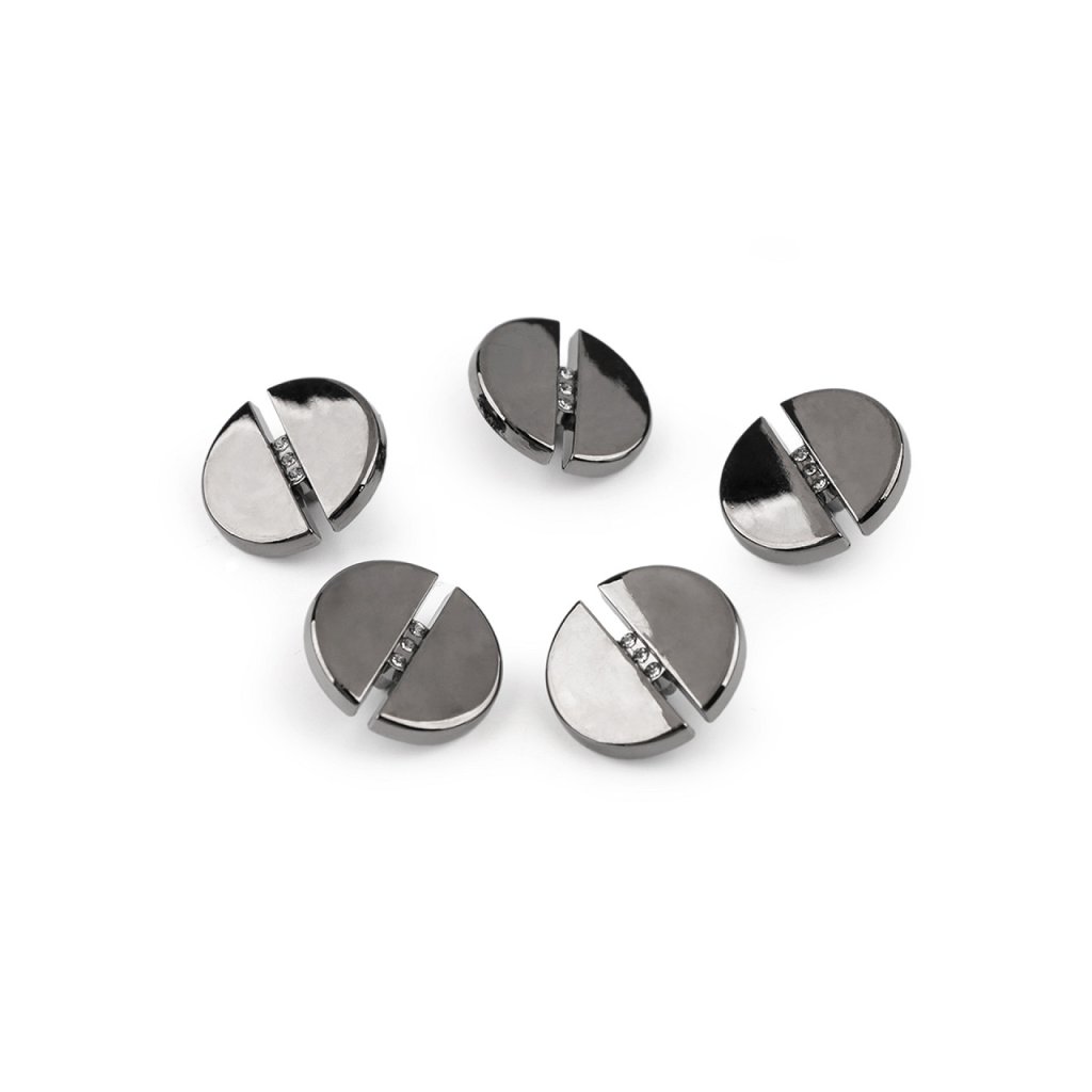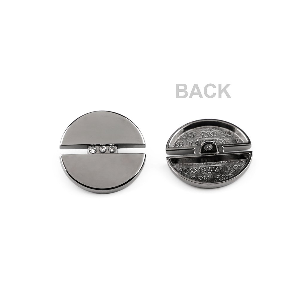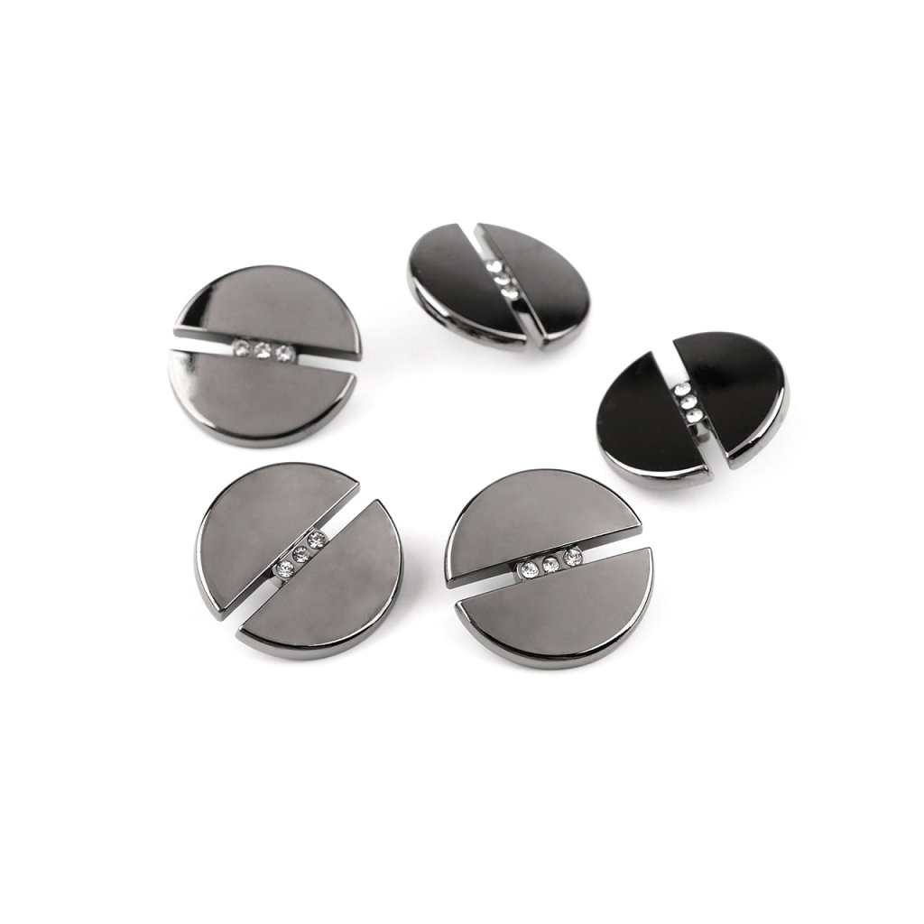Lesklé kovové knoflíky vynikají elegantním designem a kvalitním zpracováním. Jejich střed zdobí broušené kamínky. Knoflíky můžete našít na kabáty, kardigany i saka. Mají spodní přišívání.